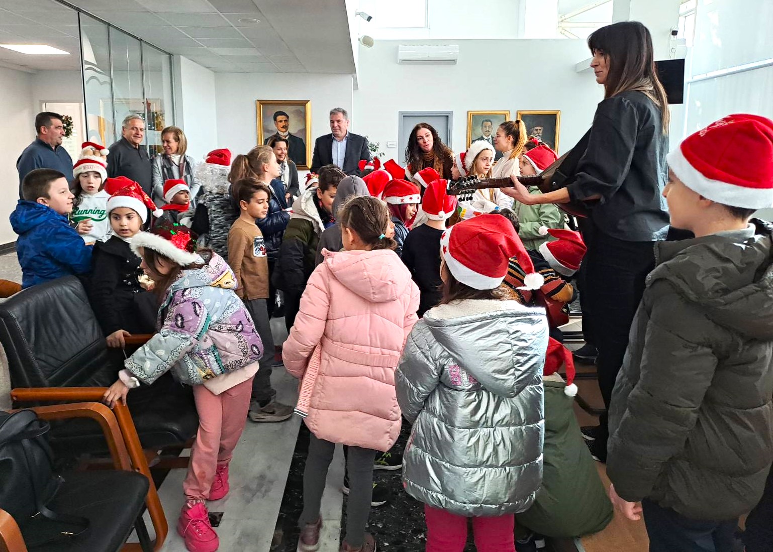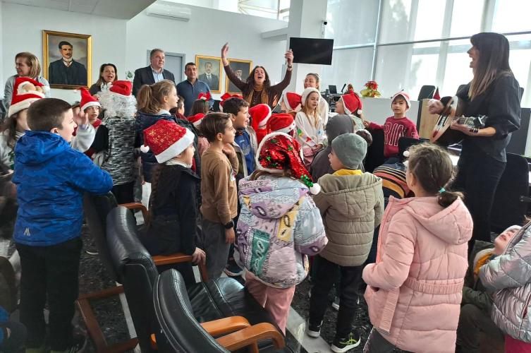 Τα παιδιά, συνοδευόμενα από τις δασκάλες τους κ.κ. Αλεξάνδρα Νικολαϊδου, Αθηνά Σβάρνα, Καρουζάκη Ζένια και Κατσαντά Βίκυ, τραγούδησαν χριστουγεννιάτικες μελωδίες υπό τους ήχους της κιθάρας που έπαιζε η δασκάλα τους.