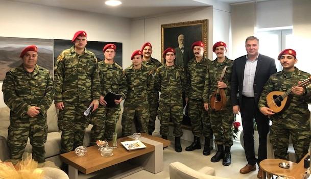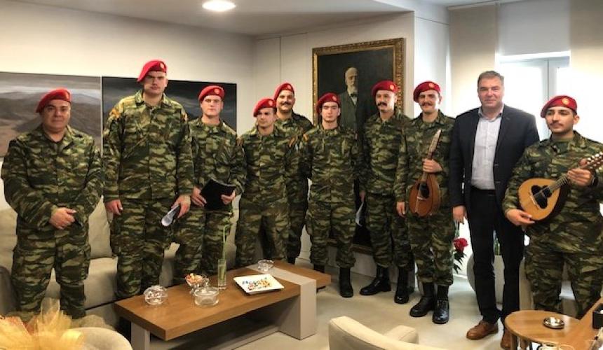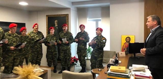 Οι φαντάροι της 5ης Αερομεταφερόμενης Ταξιαρχίας, έψαλλαν παραδοσιακά κάλαντα από την Κρήτη και την υπόλοιπη Ελλάδα, υπό τη συνοδεία λύρας και λαούτου ενώ απηύθυναν στον Αντιδήμαρχο και εξαιρετικές μαντινάδες.