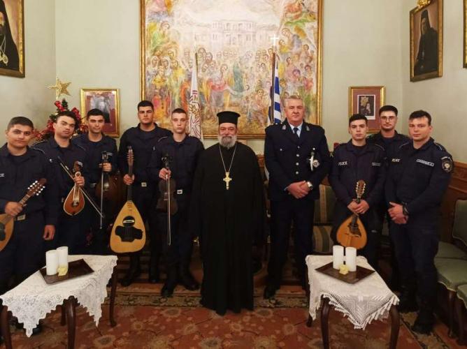 Συγκεκριμένα, την Τετάρτη, 20ή Δεκεμβρίου 2023, ο Γενικός Αρχιερατικός Επίτροπος, Αιδεσιμολ. Πρωτοπρεσβύτερος Νικόλαος Νικηφόρος υποδέχθηκε, εκ μέρους του Σεβασμιωτάτου Μητροπολίτου Ρεθύμνης και Αυλοποτάμου κ. Προδρόμου, τη χορωδία του Τμήματος Δοκίμων Αστυφυλάκων Ρεθύμνου καθώς και τη χορωδία του Συλλόγου Μικρασιατών Ρεθύμνου. Ο π. Νικόλαος μετέφερε στους καλαντιστές τις ευχές του Σεβασμιωτάτου Ποιμενάρχου μας, ο οποίος απουσίαζε στην Κωνσταντινούπολη για τις εργασίες της Αγίας και Ιεράς Συνόδου του Οικουμενικού μας Πατριαρχείου, και τους διένειμε το νέο εγκόλπιο ημερολόγιο της Μητροπόλεώς μας για το έτος 2024, που είναι αφιερωμένο στη συμπλήρωση 200 ετών από τη μαρτυρική τελείωση των Αγίων Τεσσάρων Νεομαρτύρων της πόλεώς μας (1824-2024).
