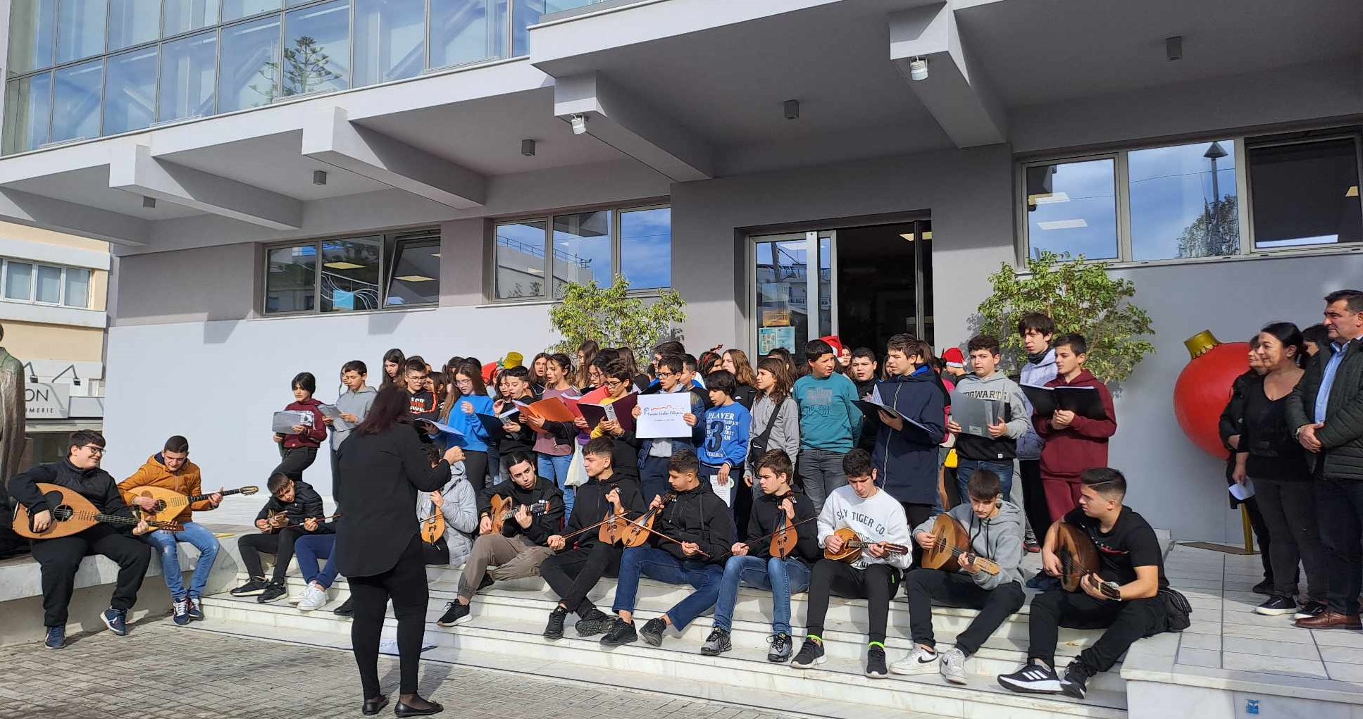 Γιορτινή και σήμερα η ατμόσφαιρα στο Δημαρχείο Ρεθύμνου. Η Χορωδία του 1ου Γυμνασίου και το Τμήμα Συνόλου Παραδοσιακής Μουσικής εξέπληξαν με την οργάνωση και τις μελωδικές φωνές των Μελών τους. Οι μαθητές και μαθήτριες του Μουσικού Σχολείου, υπό τη συνοδεία του Διευθυντή κ. Σπύρου Ραφτάκη και των καθηγητών κ.κ. Μιχάλη Υγειονομάκη και Ηρακλή Φραγκιαδάκη, προσέφεραν μια όμορφη χριστουγεννιάτικη εμπειρία στον Αντιδήμαρχο Καθαριότητας Δ.Ρ. κ. Δημήτρη Λελεδάκη, τον Δημοτικό Σύμβουλο κ. Μποτόνη Μποτονάκη, τους εργαζόμενους στο Δήμο και τους διερχόμενους, ψάλλοντας τα κάλαντα υπό τη μουσική καθοδήγηση της εκπαιδευτικού τους κας Κωνσταντίνας Γωνιωτάκη, στο προαύλιο του Δημαρχείου .