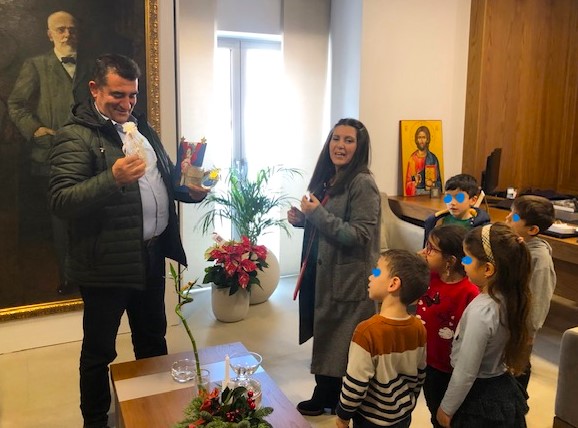 Οι γιορτινές επισκέψεις ολοκληρώθηκαν με τους μικρούς μαθητές του 5ου Νηπιαγωγείου Ρεθύμνου που με τη συνοδεία της Εκπαιδευτικού τους κας Κατσοπρινάκη Άννας προσέφεραν το χειροποίητο δώρο που είχαν ετοιμάσει για τον Δήμαρχο κ. Γιώργη Χ. Μαρινάκη, ο οποίος, λόγω ασθενείας, δεν κατάφερε να συμμετάσχει στη χριστουγεννιάτικη γιορτή του σχολείου τους. Τα παιδιά υποδέχθηκε ο κ. Λελεδάκης κι αφού τα ευχαρίστησε, αντάλλαξε μαζί τους ζεστές ευχές για υγεία και πρόοδο.