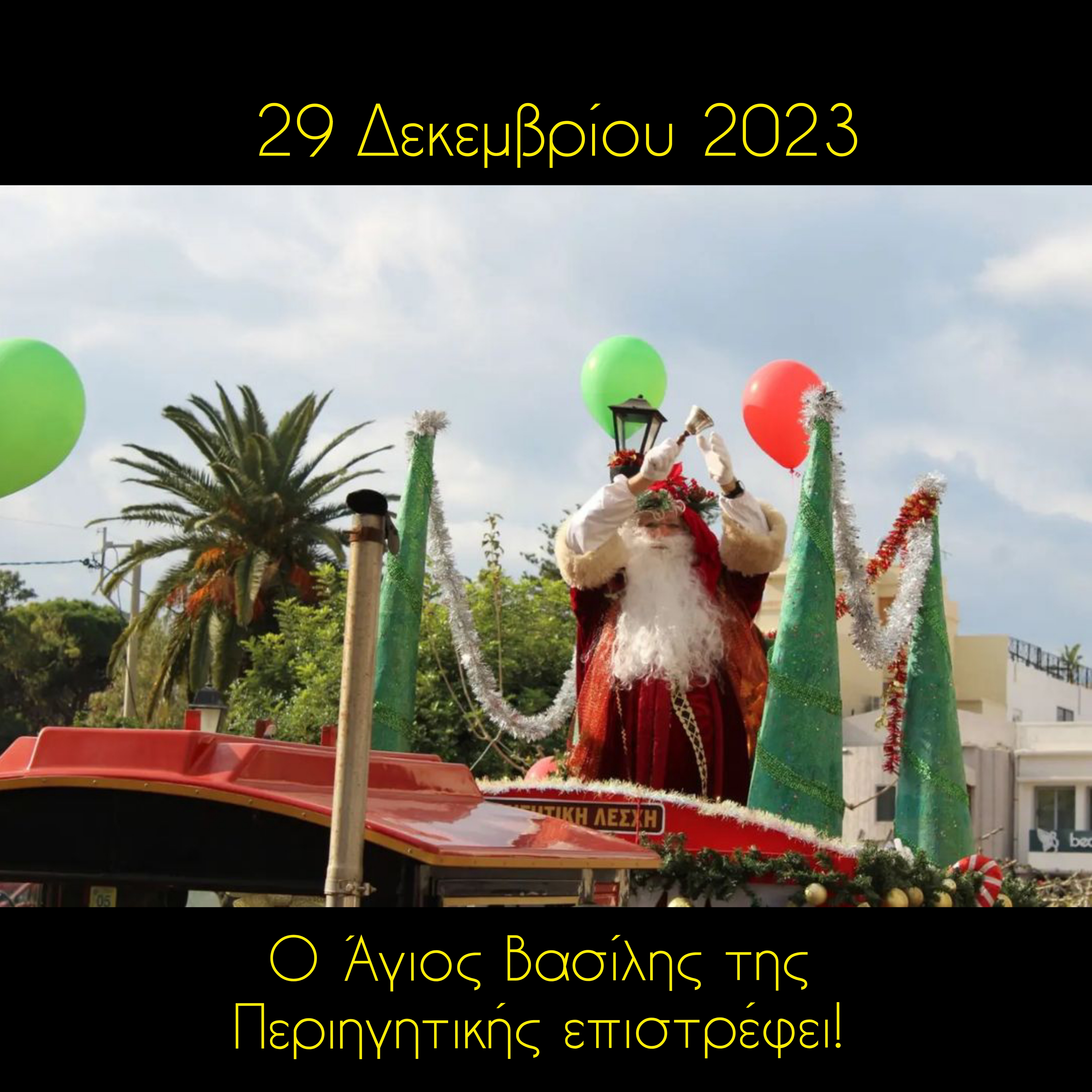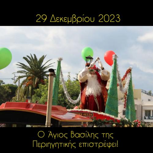 Για μια ακόμα χρονιά τα μέλη της Περιηγητικής εργάζονται πυρετωδώς για να υποδεχτούν τον Άγιο Βασίλη στις 29 Δεκεμβρίου! Ο αγαπημένος άγιος των παιδιών πάνω στο κινούμενο άρμα του θα περάσει από τα στενά της παλιάς πόλης μαζί με τα ξωτικά του και θα μοιράσει πάνω από 2.000 δωράκια σε όλους!