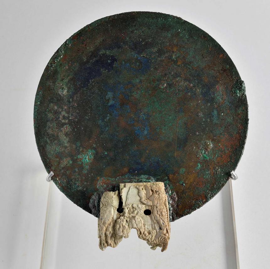 Χάλκινος καθρέφτης με οστέινη λαβή κοσμημένη με δαιμονικά όντα. Παγκαλοχώρι Ρεθύμνου, 1380-1300 π.Χ.