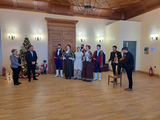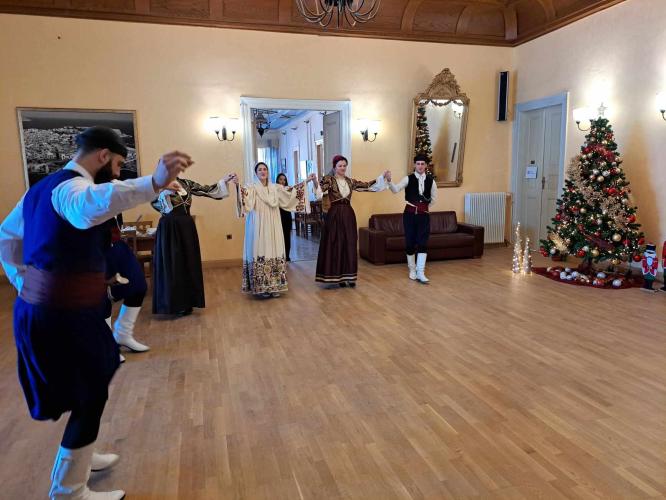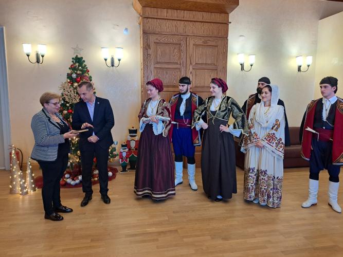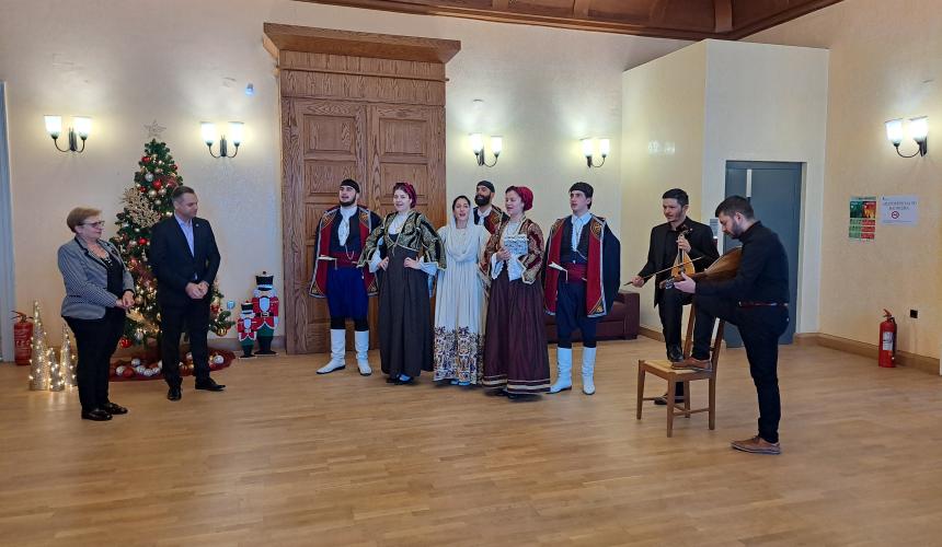 Ο Όμιλος Βρακοφόρων Κρήτης έψαλε τα Παραδοσιακά Κρητικά Κάλαντα με τη συνοδεία λύρας και χόρεψε συρτό. Η Αντιπεριφερειάρχης Ρεθύμνης καλωσόρισε τα μέλη του Ομίλου, που όπως χαρακτηριστικά ανέφερε, αποτελεί εδώ και δεκαετίες έναν από τους καλύτερους πρεσβευτές της Κρήτης, εντός και εκτός συνόρων. Ο Πρόεδρος του Ομίλου Βρακοφόρων Κρήτης, κ. Γιάννης Πετράκης, με την σειρά του ευχαρίστησε την κα Λιονή για τη διαχρονική στήριξη της Περιφέρειας Κρήτης στις δραστηριότητες του Ομίλου, της αφιέρωσε μια μαντινάδα και της δώρισε με την ευκαιρία το επετειακό ημερολόγιο του Ομίλου.