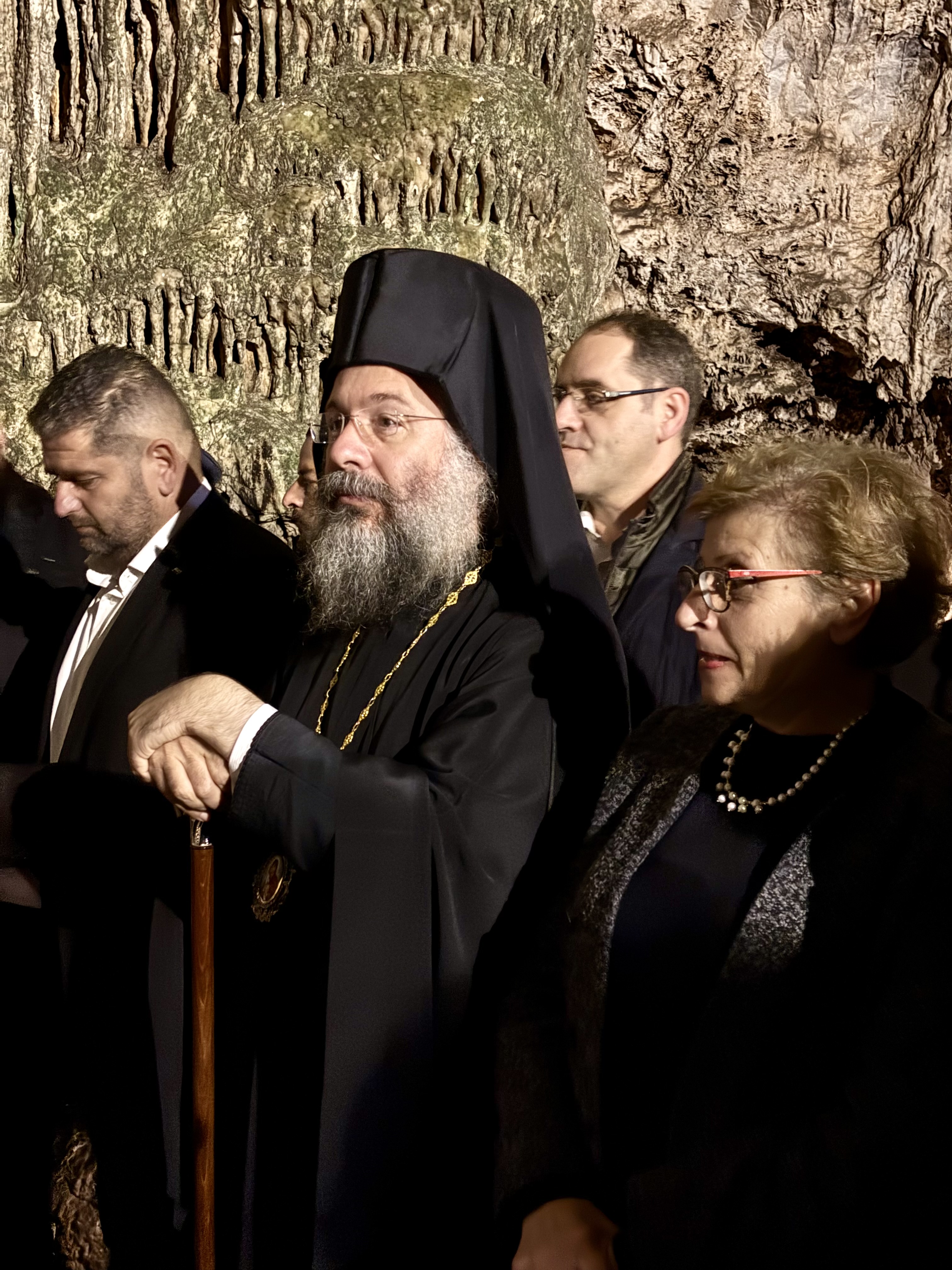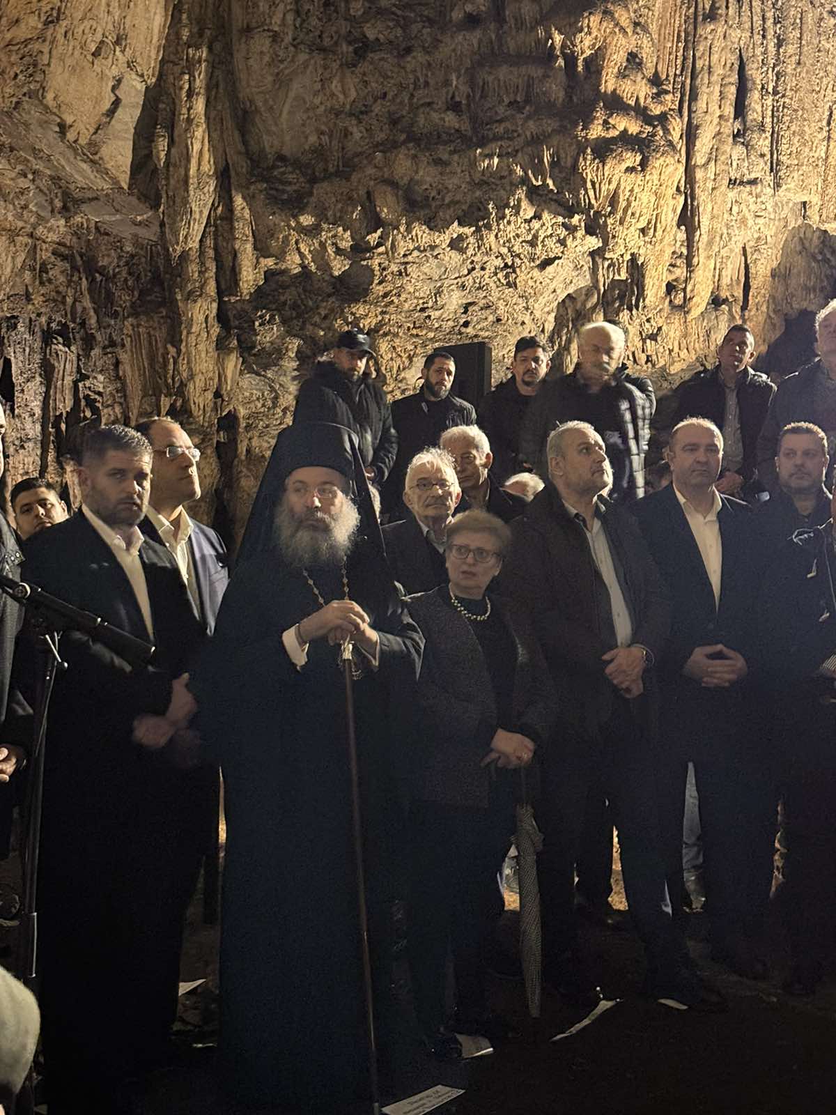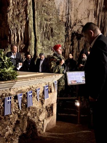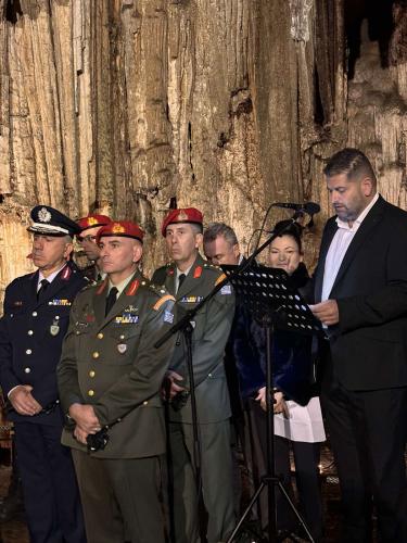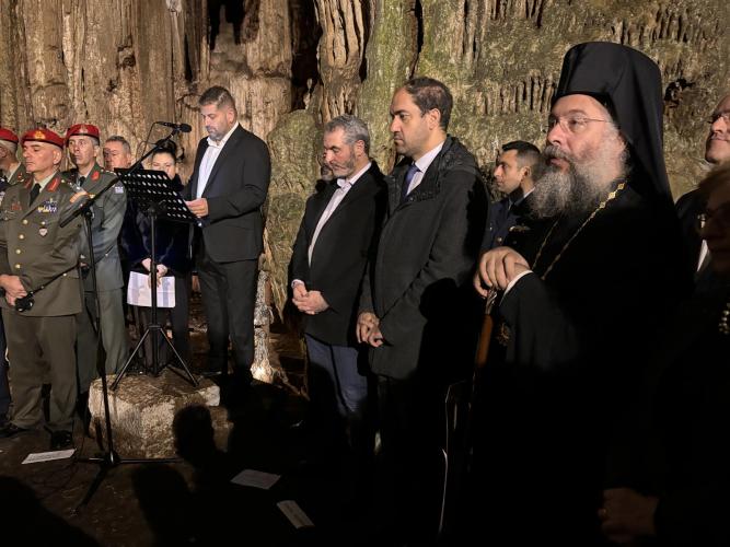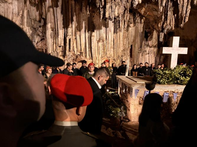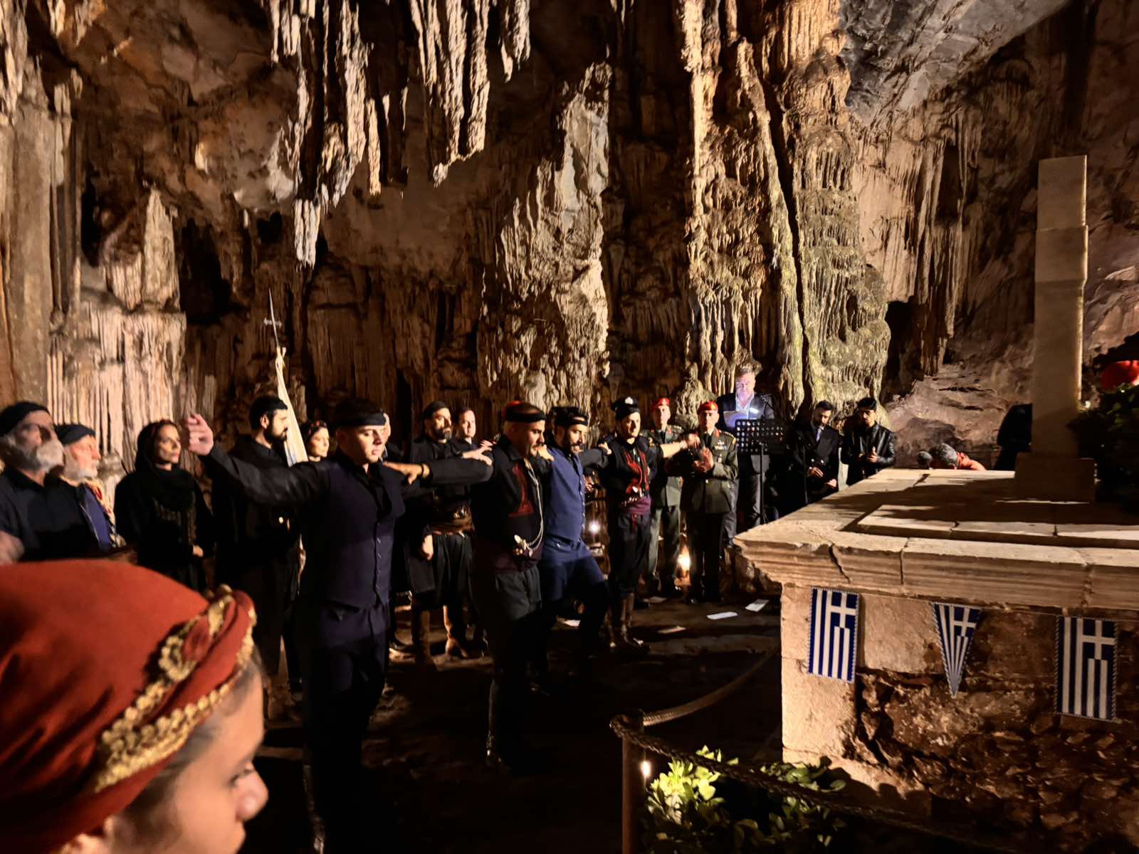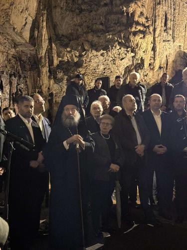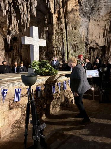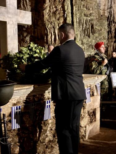 Στη συνέχεια ο Σεβασμιότατος τέλεσε επιμνημόσυνη δέηση, μια στιγμή βαθιάς συμβολικής και πνευματικής σημασίας, που προηγήθηκε της τελετής απόδοσης τιμών. Η τελετή διεξήχθη στον ιερό χώρο του σπηλαίου, εκεί όπου ευρίσκεται ο τάφος που φιλοξενεί τα ιερά οστά των θυμάτων - έναν τόπο μνήμης που ενσαρκώνει τη θυσία και το ηρωισμό των ανθρώπων που έχασαν τη ζωή τους.
