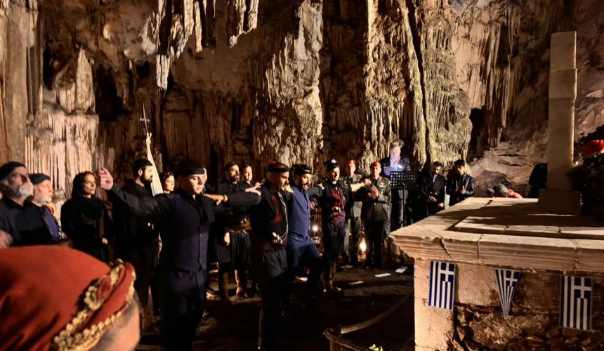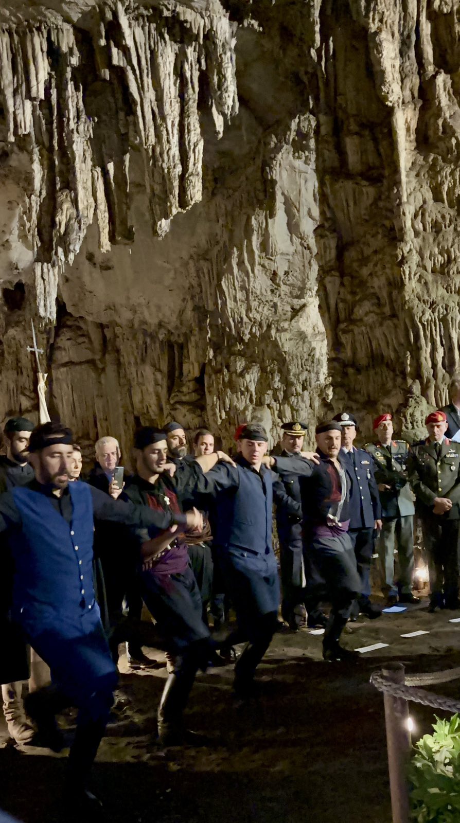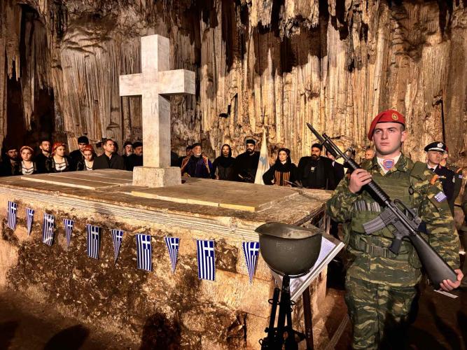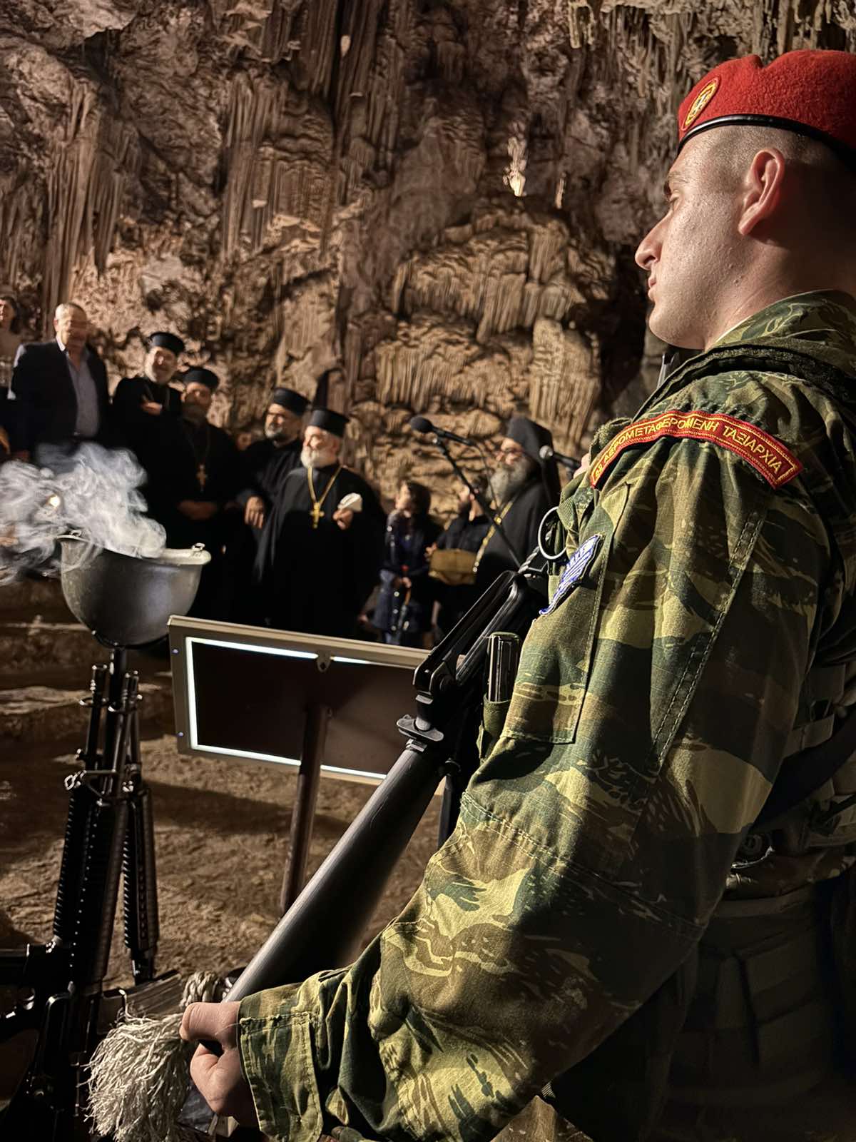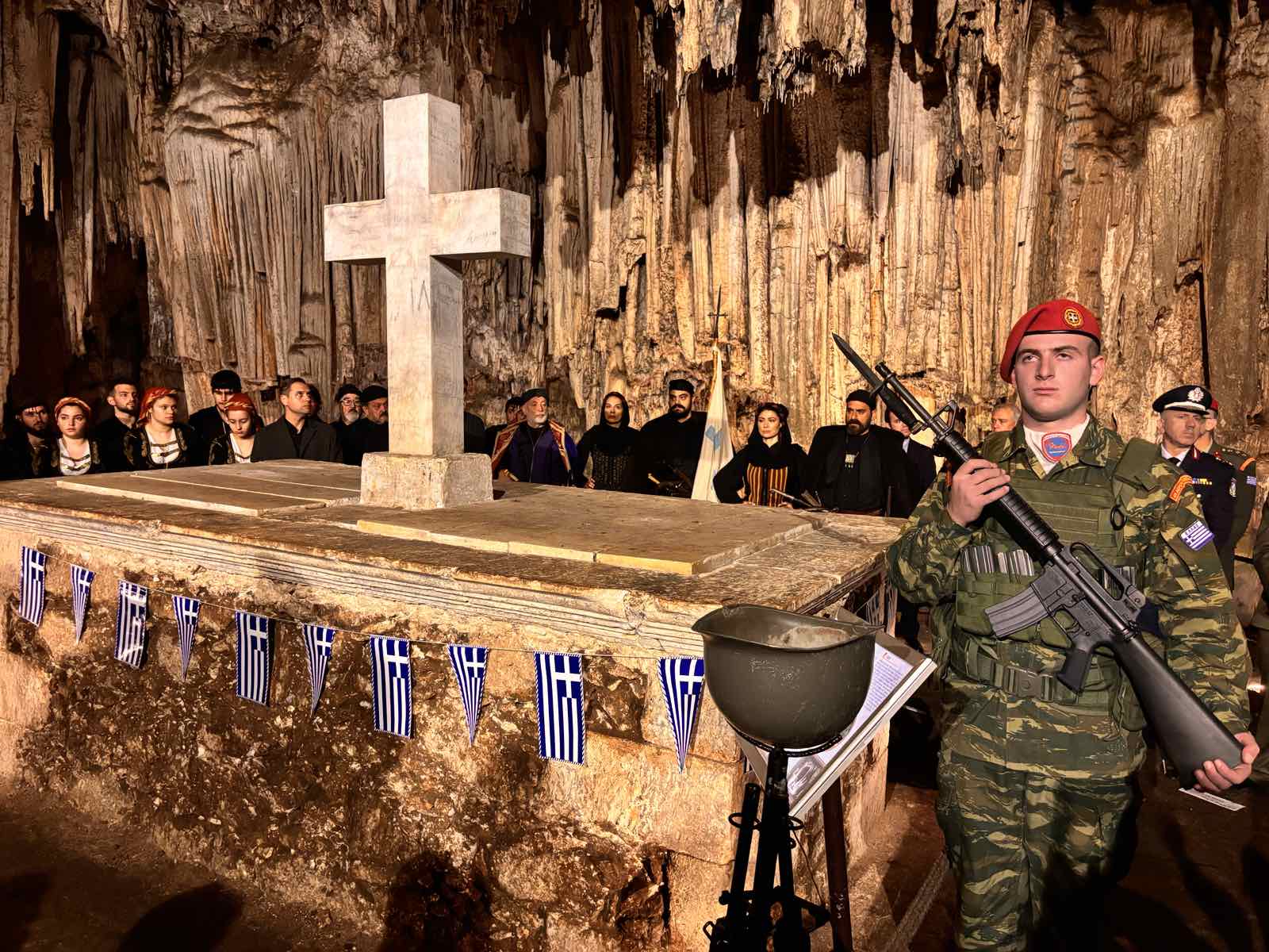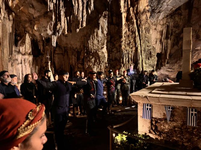 Στη συνέχεια ο Σεβασμιότατος τέλεσε επιμνημόσυνη δέηση, μια στιγμή βαθιάς συμβολικής και πνευματικής σημασίας, που προηγήθηκε της τελετής απόδοσης τιμών. Η τελετή διεξήχθη στον ιερό χώρο του σπηλαίου, εκεί όπου ευρίσκεται ο τάφος που φιλοξενεί τα ιερά οστά των θυμάτων - έναν τόπο μνήμης που ενσαρκώνει τη θυσία και το ηρωισμό των ανθρώπων που έχασαν τη ζωή τους.