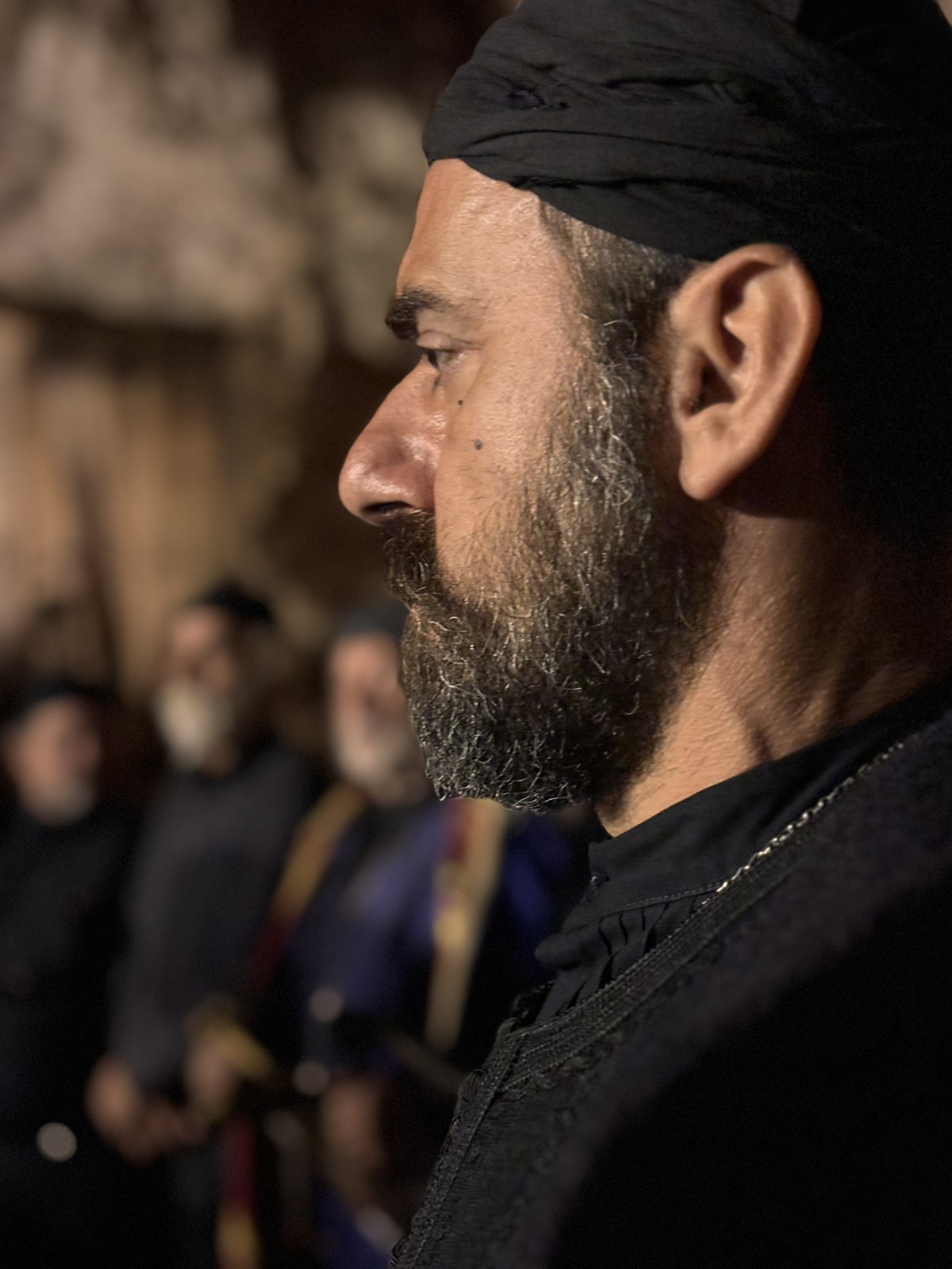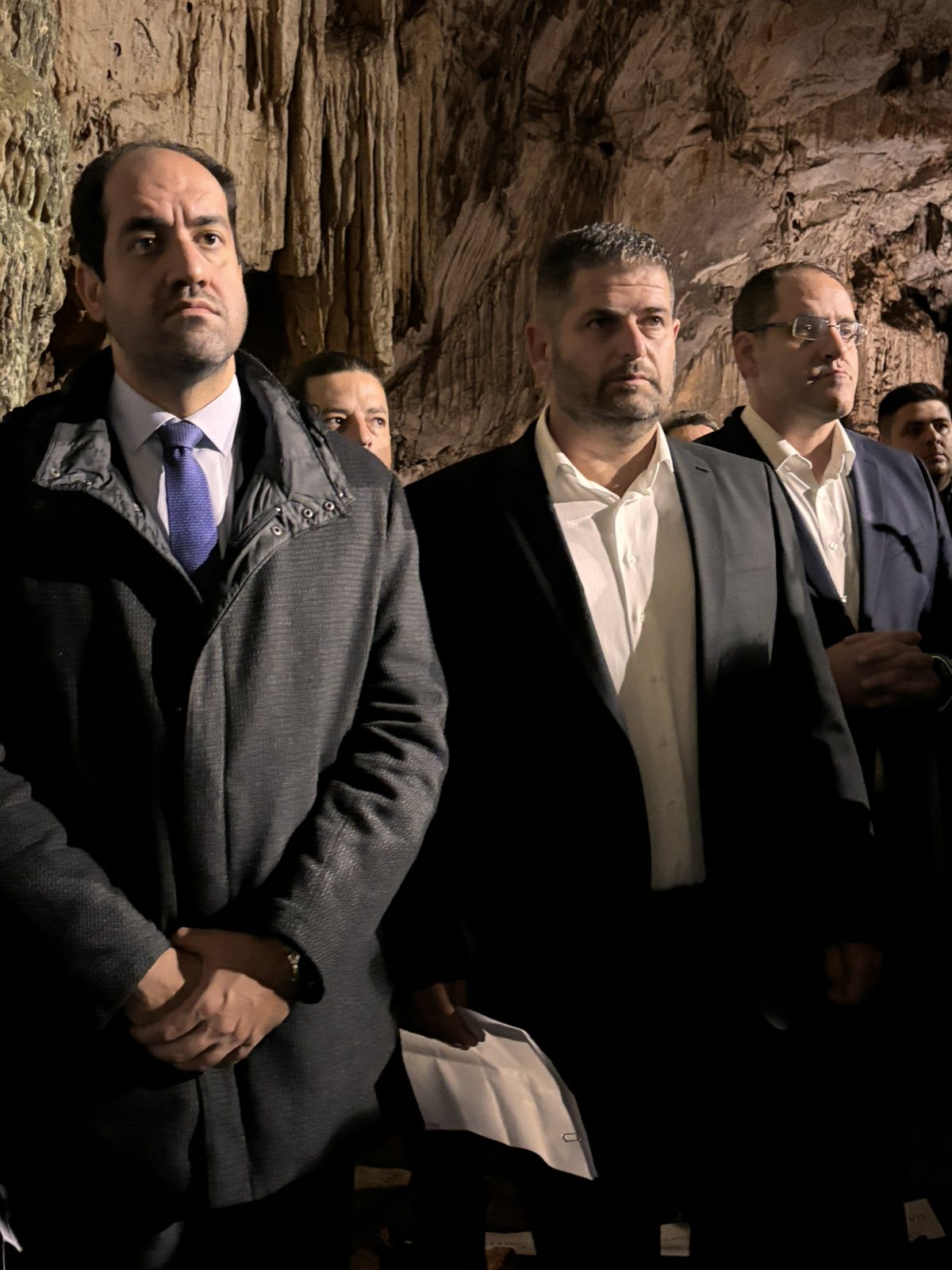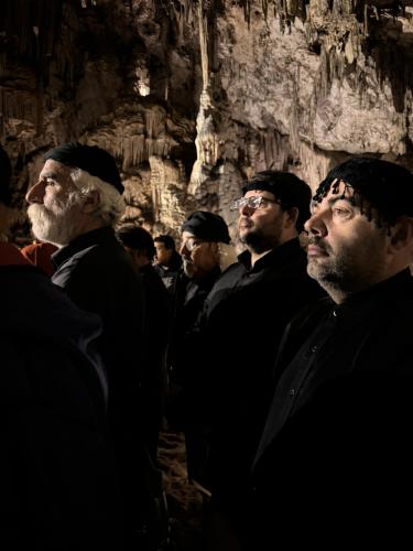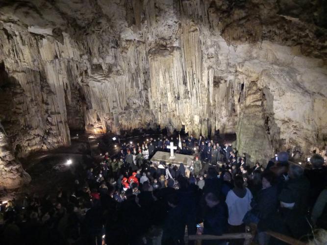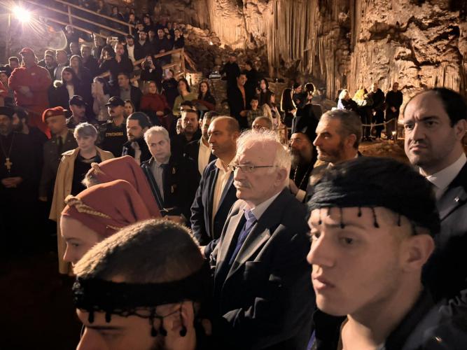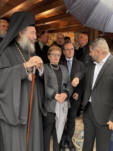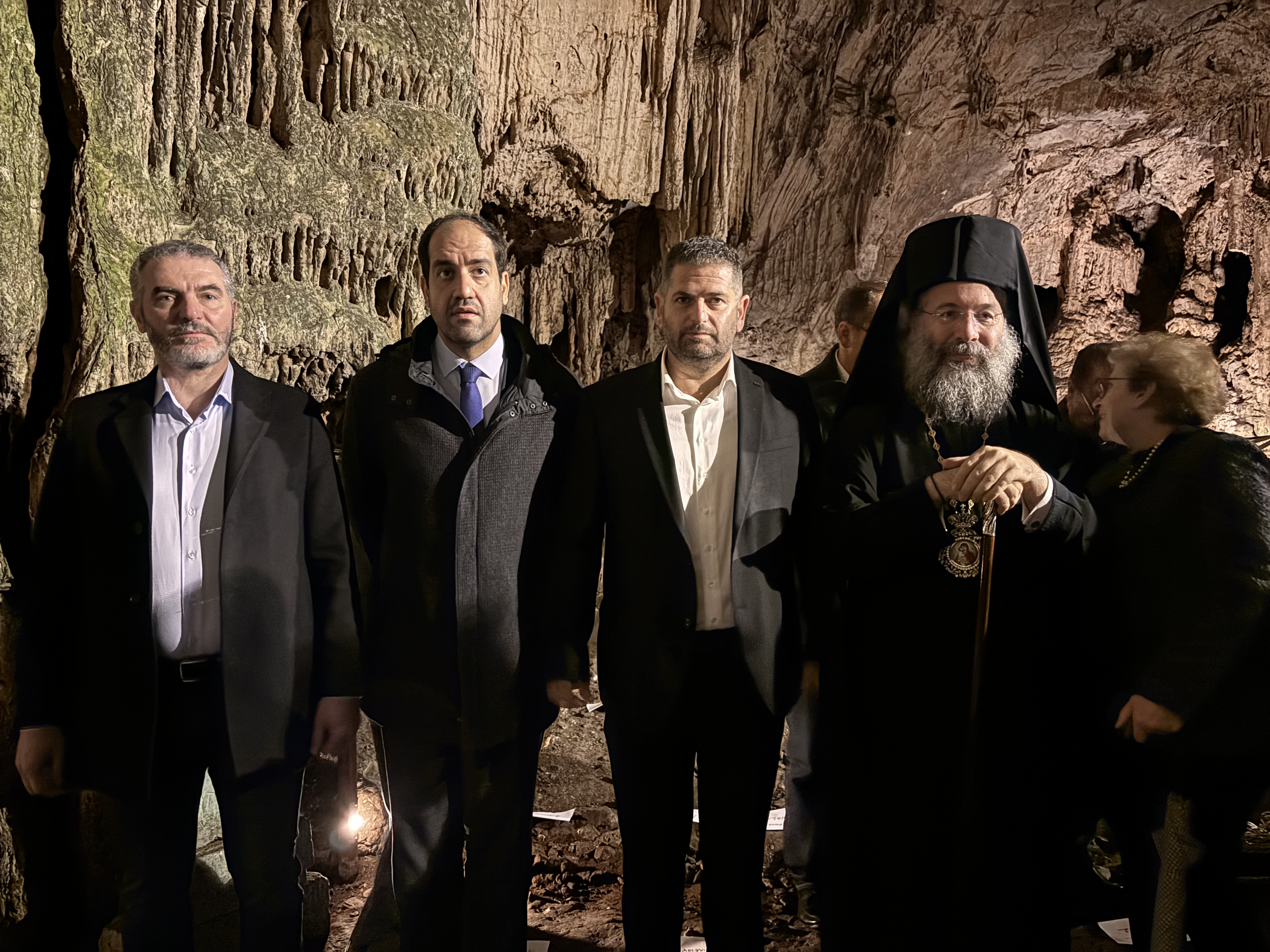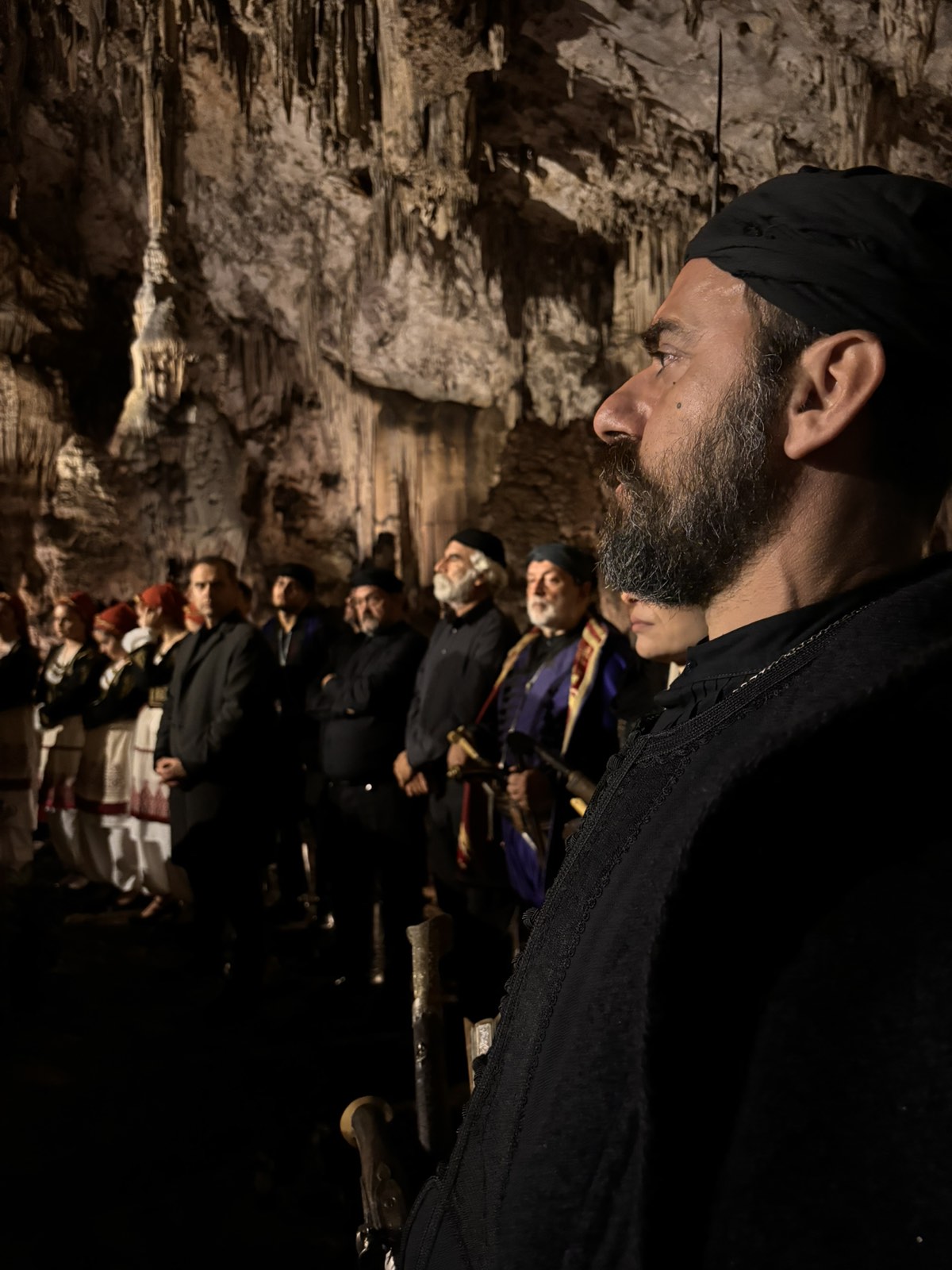 Στη συνέχεια ο Σεβασμιότατος τέλεσε επιμνημόσυνη δέηση, μια στιγμή βαθιάς συμβολικής και πνευματικής σημασίας, που προηγήθηκε της τελετής απόδοσης τιμών. Η τελετή διεξήχθη στον ιερό χώρο του σπηλαίου, εκεί όπου ευρίσκεται ο τάφος που φιλοξενεί τα ιερά οστά των θυμάτων - έναν τόπο μνήμης που ενσαρκώνει τη θυσία και το ηρωισμό των ανθρώπων που έχασαν τη ζωή τους.