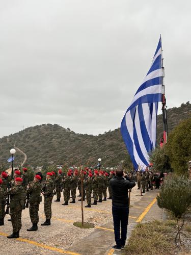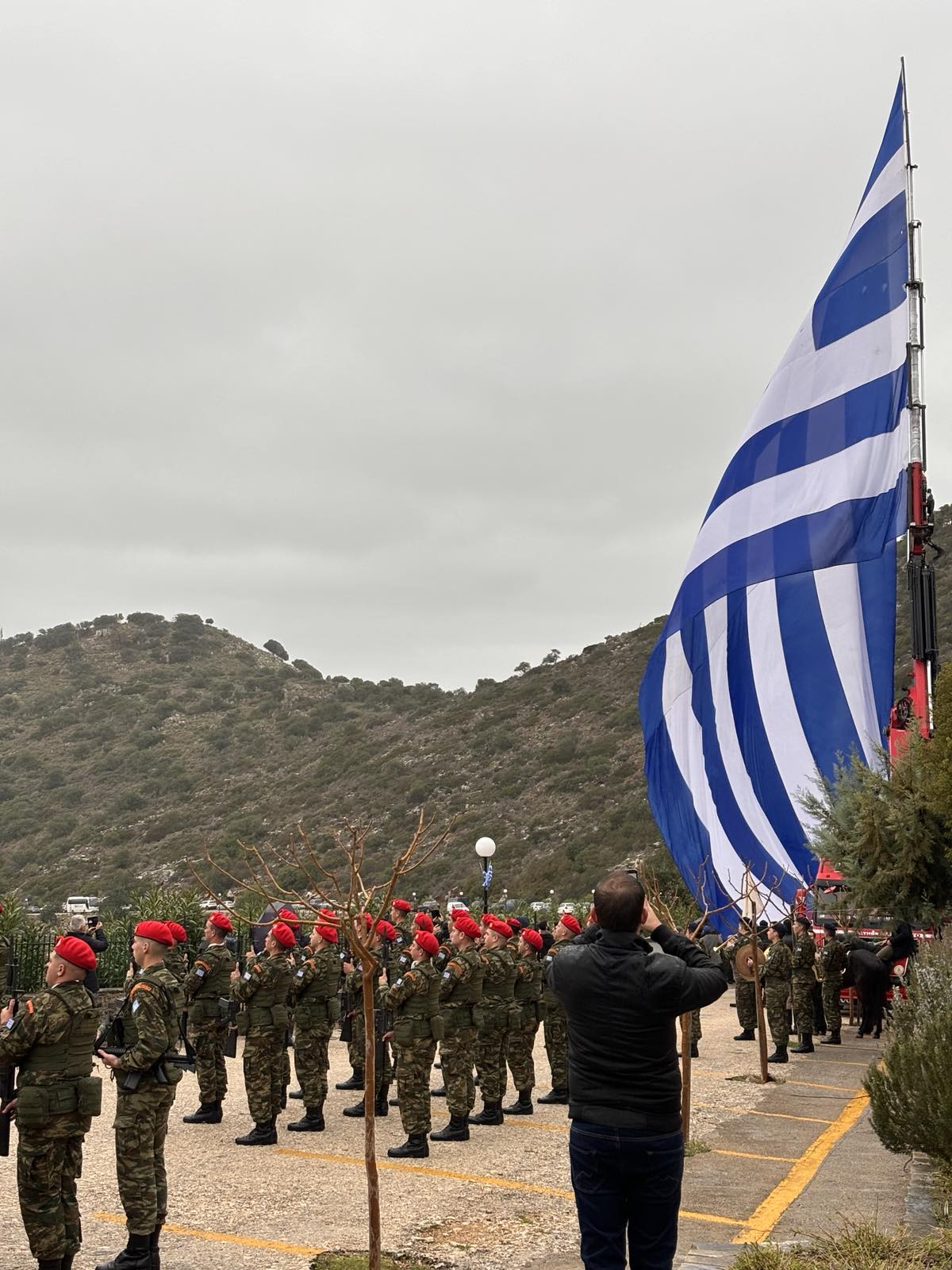 Ακολούθησε η έπαρση της Ελληνικής Σημαίας μεγέθους 300 τετραγωνικών μέτρων. Με το τμήμα Στρατιωτικής Μουσικής & Αποδόσεων τιμών του 547 ΑΜ/ΤΟ , το τμήμα Αναβιωτών Όμιλου Βρακοφόρων Κρήτης και του Ιππικού Συλλόγου Γεωργαλίδικων Αλόγων Ρεθύμνου “Αϊ Γιώργης” να απαγγέλουν τον Εθνικό μας ύμνο φανερά συγκινημένοι παρουσία πλήθους κόσμου αψηφώντας το κρύο και τη βροχή.