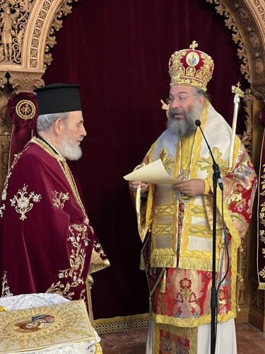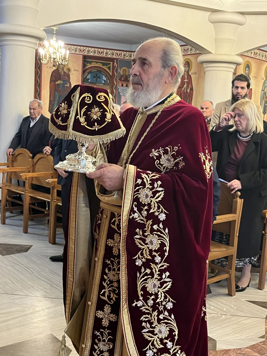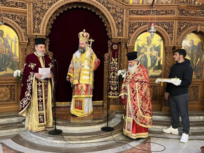 Προ της απολύσεως της Θείας Λειτουργίας, ο Σεβασμιώτατος Ποιμενάρχης μας, εξ αφορμής της αφυπηρετήσεως του Αιδεσιμολογιωτάτου Πρωτοπρεσβυτέρου του Οικουμενικού Θρόνου Νικολάου Πολάκη, επέδωσε σε αυτόν την εύφημο μνεία της Ιεράς Μητροπόλεώς μας για την πολυετή εκκλησιαστική του διακονία, καθώς και ένα Επιγονάτιο με τη μορφή του Κυρίου μας Ιησού Χριστού.