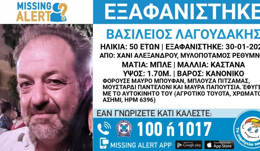 Στις 30/10/2023, μεσημεριανές ώρες, εξαφανίστηκε από την περιοχή Χάνι Αλεξάνδρου στο Μυλοπόταμο Ρεθύμνου, ο Λαγουδάκης Βασίλειος, 50 ετών. «Το Χαμόγελο του Παιδιού» ενημερώθηκε σήμερα για την εξαφάνιση του Λαγουδάκη Βασίλειου και προχώρησε στη δημοσιοποίηση των στοιχείων του ενήλικα κατόπιν αιτήματος της οικογένειας του, καθώς συντρέχουν σοβαροί λόγοι, οι οποίοι θέτουν τη ζωή του σε κίνδυνο.