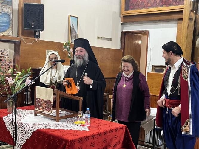 Κατόπιν η πρόεδρος έδωσε στον σεβασμιώτατο ένα πρες παπιέ από το Μουσείο Μπενάκη για το γραφείο του και στον κ. Καπαϊδονάκη το βιβλίο «Δάκρυα σε φύλλα δάφνης» που εξέδωσε το Λύκειο για τα 200 χρόνια από την Ελληνική Επανάσταση του 1821 και τα δύο συμβολικά δώρα, ταπεινή έκφραση ευγνωμοσύνης κι εκτίμησης.