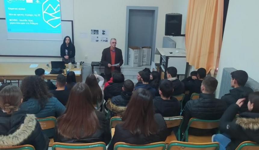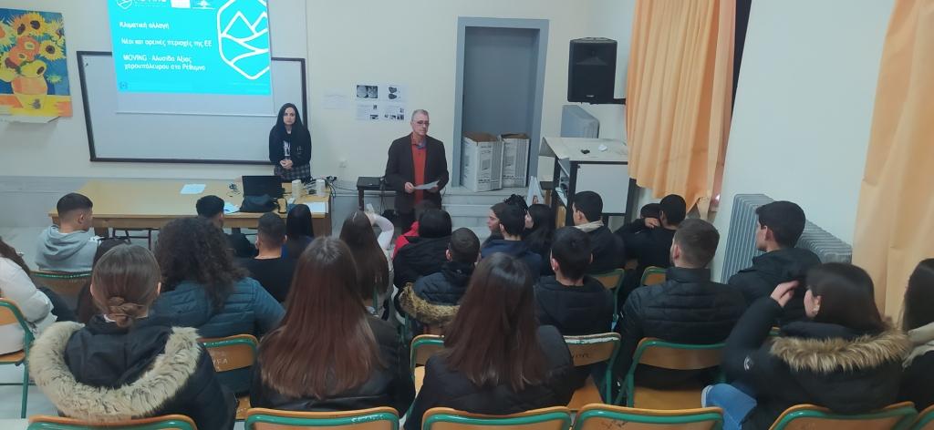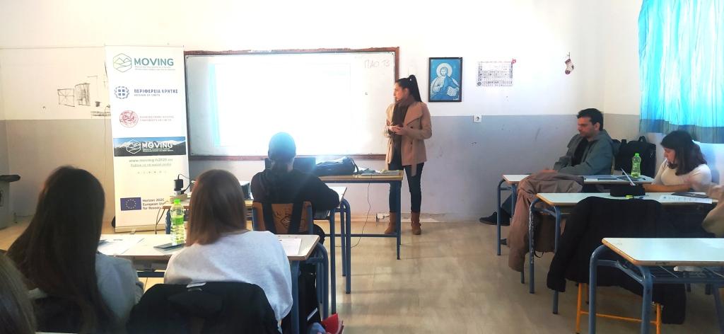 Κατά την διάρκεια των συναντήσεων παρουσιάστηκαν, το έργο MOVING το οποίο υλοποιείται στο πλαίσιο του προγράμματος HORIZON 2020, που πλέον βρίσκεται κοντά στο σημείο ολοκλήρωσής του, και τα ευρήματα της μέχρι τώρα πορείας του. Επιπλέον οι μαθητές ενημερώθηκαν σχετικά με το φαινόμενο της κλιματικής αλλαγής και για τη δυνατότητα που τους δίνεται μέσα από το έργο MOVING να εκφράσουν τις δικές τους απόψεις, τις σκέψεις και ανησυχίες τους για το μέλλον και των ορεινών περιοχών της Κρήτης.