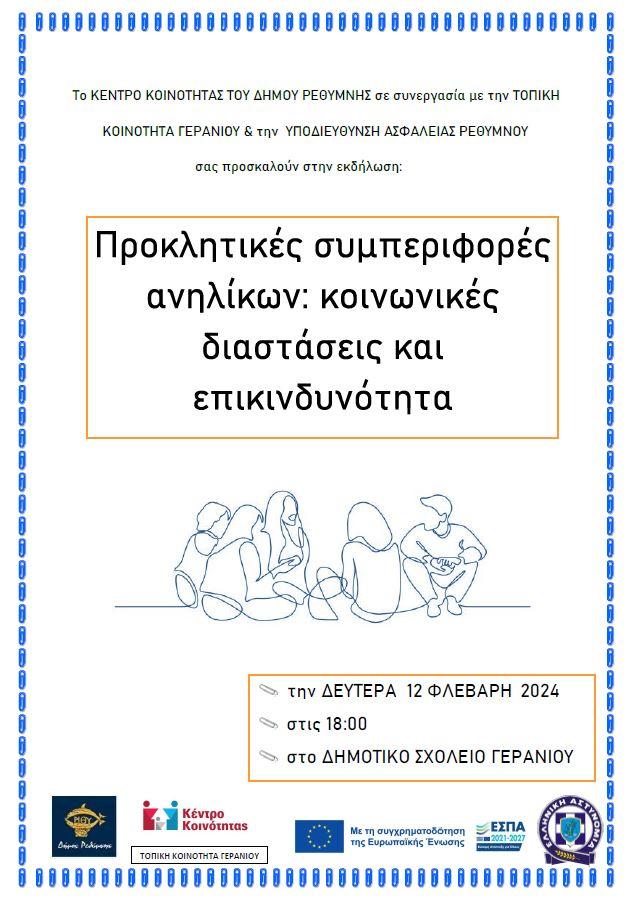 Το εξαιρετικά ενδιαφέρον και – δυστυχώς- διαχρονικά επίκαιρο θέμα «Προκλητικές συμπεριφορές ανηλίκων: κοινωνικές διαστάσεις και επικινδυνότητα», θα αναλυθεί στο πλαίσιο εκδήλωσης που συνδιοργανώνουν το Κέντρο Κοινότητας της Διεύθυνσης Κοινωνικών Υπηρεσιών του Δήμου Ρεθύμνης, η Τοπική Κοινότητα Γερανίου και η Υποδιεύθυνση Ασφαλείας Ρεθύμνου.