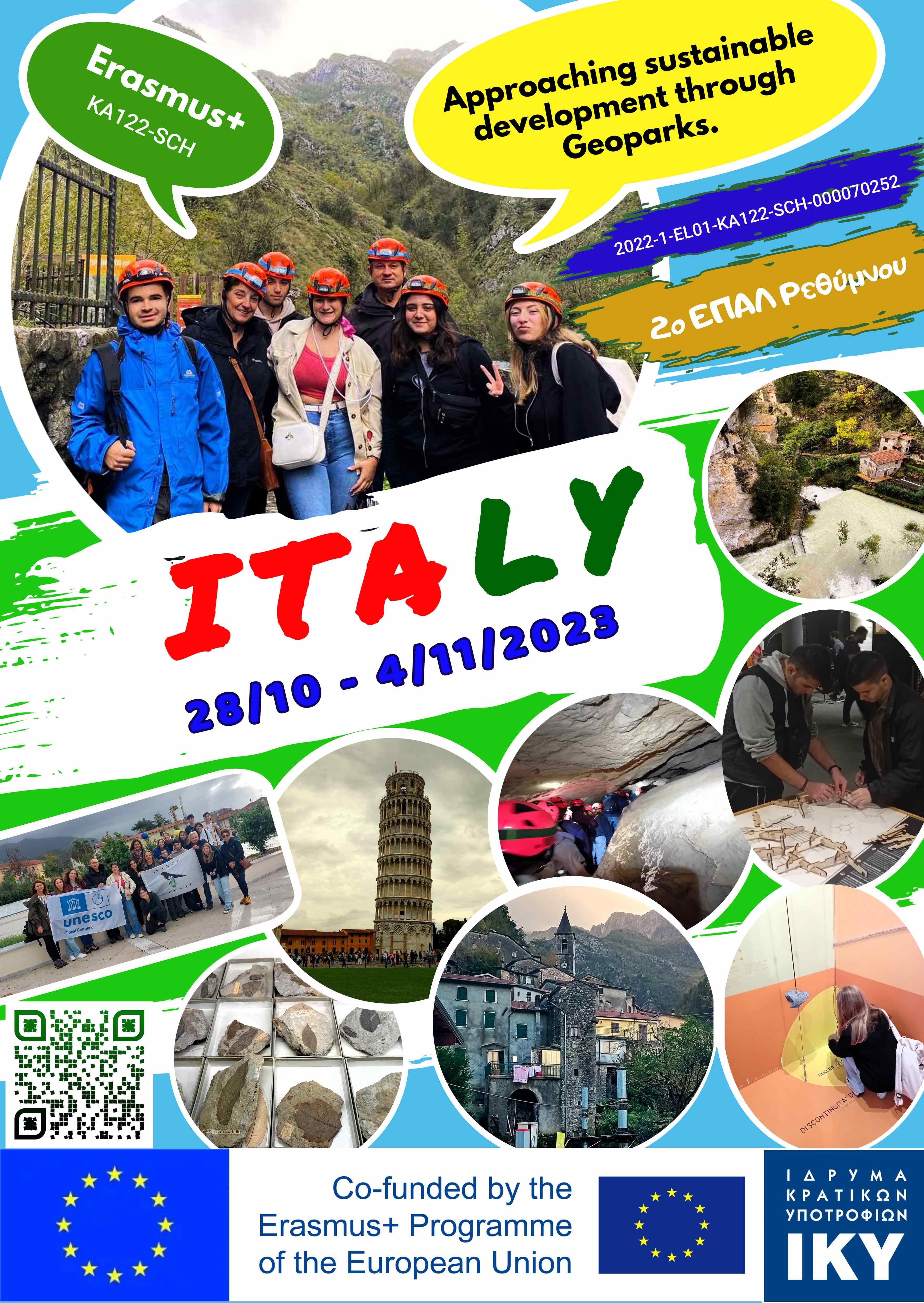 Το 2ο ΕΠΑΛ Ρεθύμνου πραγματοποίησε το διάστημα 28/10 – 4/11/2023 την πέμπτη κινητικότητα μαθητών στην Ιταλία στα πλαίσια του προγράμματος Erasmus+, με τίτλο “Προσεγγίζοντας τη βιώσιμη ανάπτυξη μέσα από τα Γεωπάρκα” και κωδικό 2022-1-EL01-KA122-SCH-000070252.