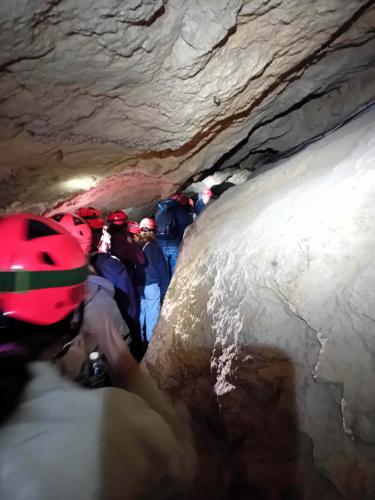 Ακολούθησε μετάβαση σε κοντινό σπήλαιο της περιοχής όπου έγινε ενημέρωση για τις εργασίες ανασκαφής που γίνονται εκεί καθώς και για τα ευρήματα σχετικά με την προϊστορική πανίδα της περιοχής τα οποία και είδαμε στο μικρό μουσείο που έχει κατασκευασθεί. Τέλος με κατάβαση χαμηλά στο σπήλαιο μπορέσαμε να δούμε τα νερά που έρχονταν από υπόγειες πηγές.