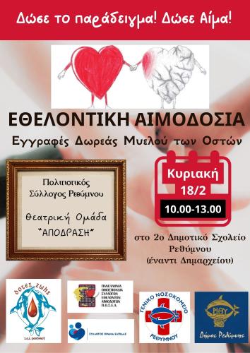 Μία κοινή δράση από τον Σύλλογο Εθελοντών Αιμοδοτών Ν. Ρεθύμνου "Δότες Ζωής" και το Τμήμα Αιμοδοσίας του Γενικού Νοσοκομείου Ρεθύμνου που σκοπό έχει να χαρίσει ζωή κι ελπίδα!