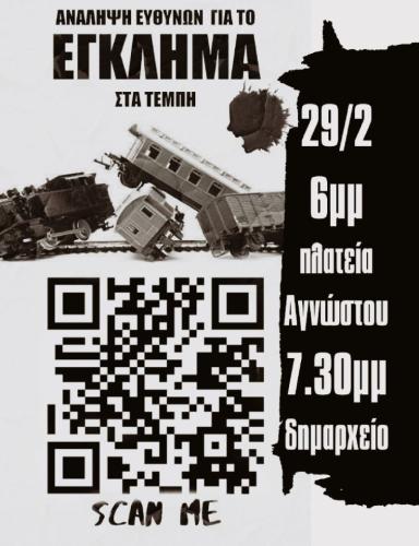 Μια τελετουργική δράση, ένα χορευτικό δρώμενο στη μνήμη των θυμάτων των Τεμπών και στήριξης του αγώνα των συγγενών των θυμάτων της φοβερής δολοφονίας των Τεμπών, για την άρση της ασυλίας των βουλευτών και την τιμωρία των υπευθύνων της τραγωδίας, θα πραγματοποιηθεί την Πέμπτη 29 Φεβρουαρίου στις 6 το απόγευμα με αφετηρία την πλατεία του Αγνώστου Στρατιώτη στο Ρέθυμνο.
