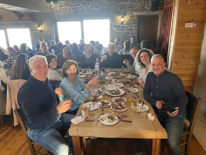 Μετά από τις ωραίες εντυπώσεις που αποκομίσαμε από τις κρυμμένες ομορφιές του τόπου μας, όπου η φύση μπορεί να συμβιώσει με τον άνθρωπο όταν αυτός την σέβεται και την προστατεύει, καταλήξαμε σε ταβέρνα με ορεινό καταφύγιο στις παρειές του Ψηλορείτη κοντά στα Λειβάδια με πλουσιοπάροχο φαγητό και θέα που κόβει την ανάσα . Με συζήτηση και καλή διάθεση κόψαμε την πίτα του Συλλόγου μας, με την ευχή να έχουμε υγεία ,να είμαστε αισιόδοξοι και δημιουργικοί και να ανταμώνουμε σε ωραίες δραστηριότητες .