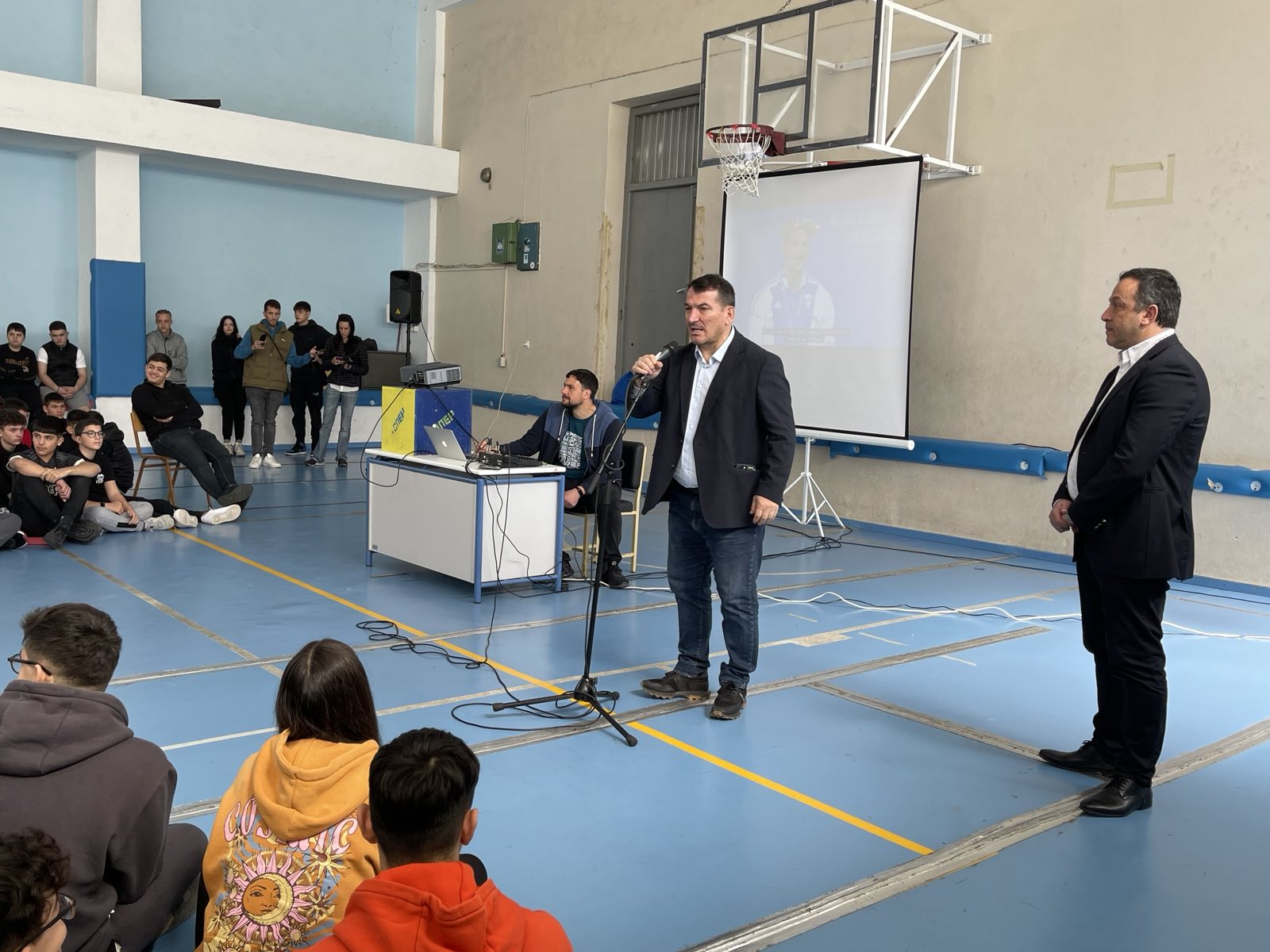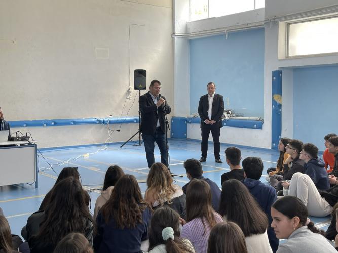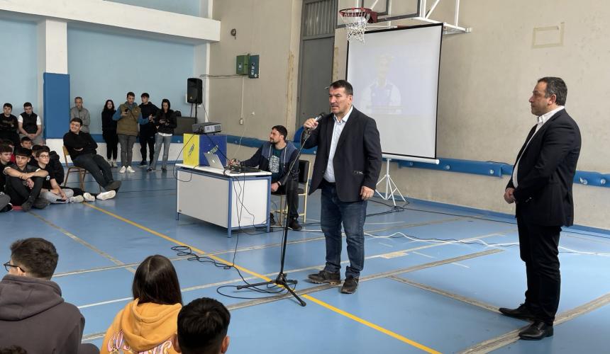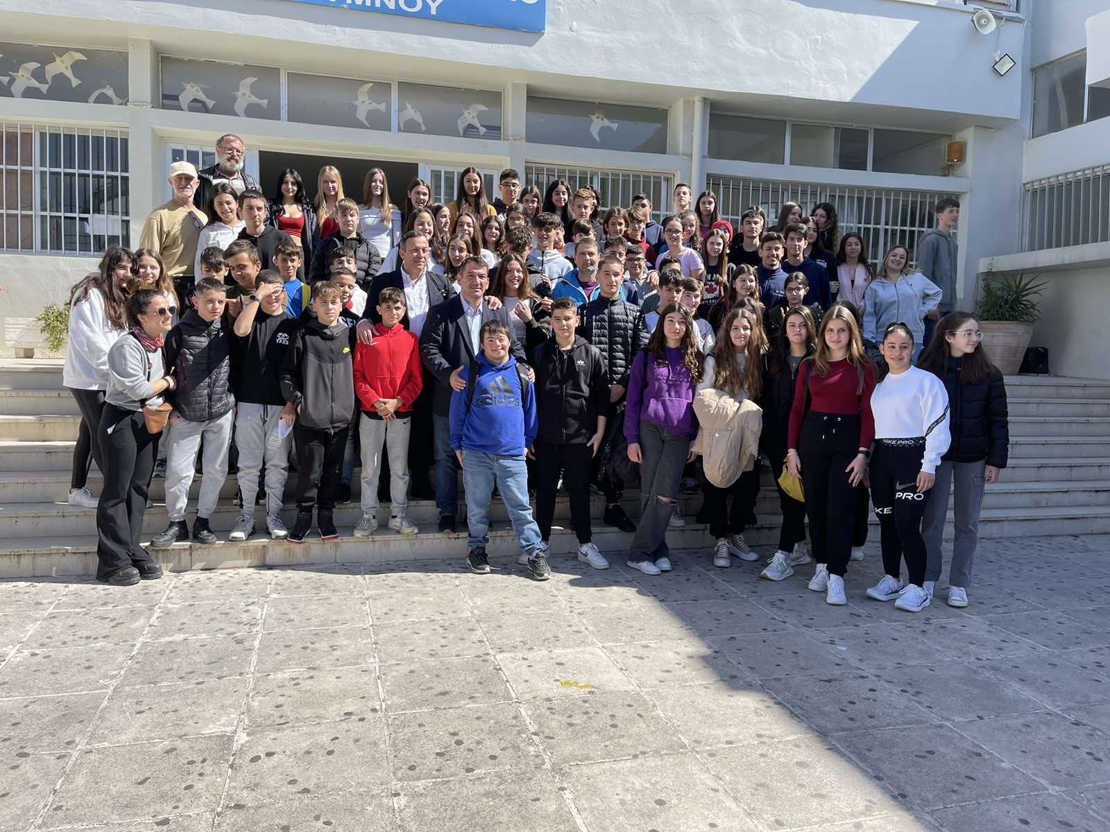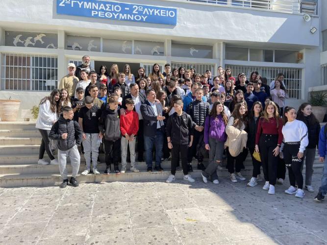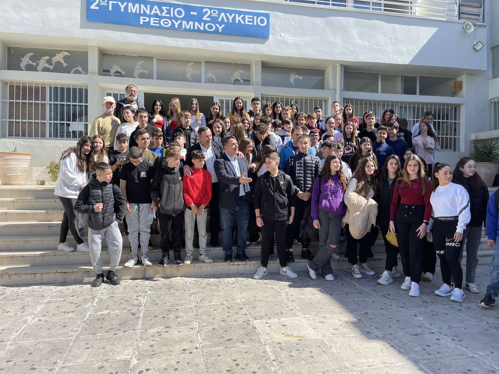 Στο Ρέθυμνο επισκέφθηκε το 2ο Γυμνάσιο όπου μίλησε σε μαθητές για τον αθλητισμό και απάντησε σε όλες τις ερωτήσεις τους. Τον Πύρρο Δήμα υποδέχθηκε στο σχολείο ο αντιδήμαρχος αθλητισμού Νίκος Προβιάς και ο εκπρόσωπος του συλλόγου γονέων και φίλων ατόμων με αυτισμό Ρεθύμνου Γαβριήλ Τσουντάνης.