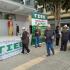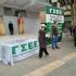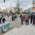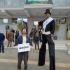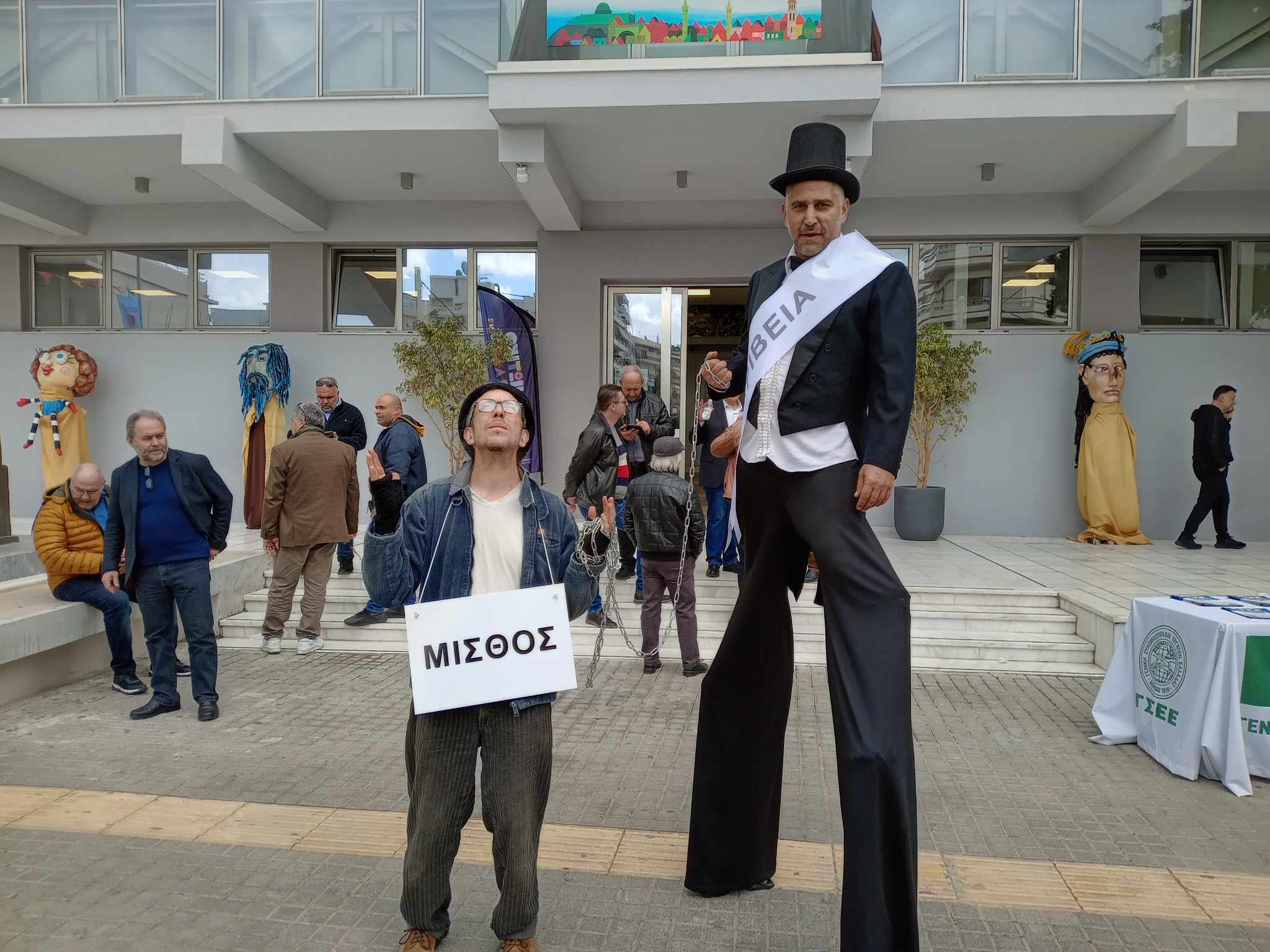 Οι περαστικοί αντικρίζουν ένα συμβολικό δρώμενο που δείχνει την ακρίβεια στα ύψη (σε ξυλοπόδαρα) που έχει αλυσοδέσει τους μισθούς οι οποίοι είναι σε άσχημη κατάσταση.