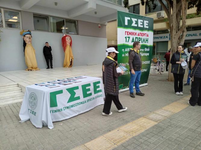 Υπενθυμίζεται ότι από τον περασμένο Γενάρη το Γενικό Συμβούλιο της ΓΣΕΕ αποφάσισε Γενική πανελλαδική απεργία στις 17 Απριλίου και τα κλιμάκια των συνδικάτων με επικεφαλής στελέχη της Συνομοσπονδίας πραγματοποιούν στοχευμένες παρεμβάσεις σε 30 νομούς της χώρας.