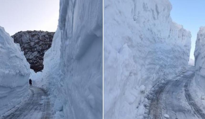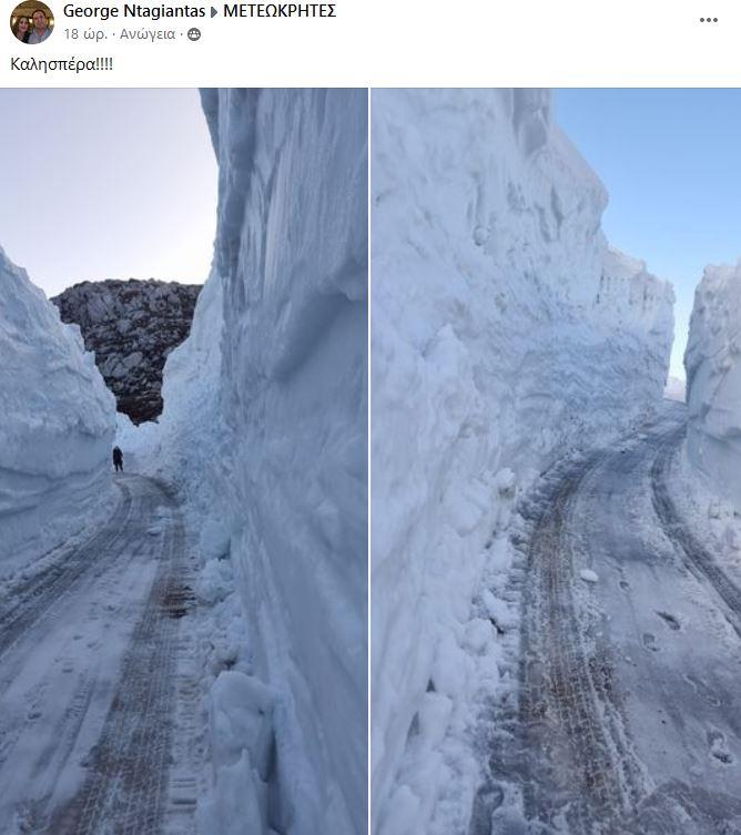 Το χιόνι που έχει συσσωρευτεί κατά τη διάρκεια του χειμώνα, υψώνεται σε πολλά μέτρα δημιουργώντας στο σημείο Κέραμος δυο πελώρια «τείχη χιονιού» από τις δυο πλευρές του δρόμου.