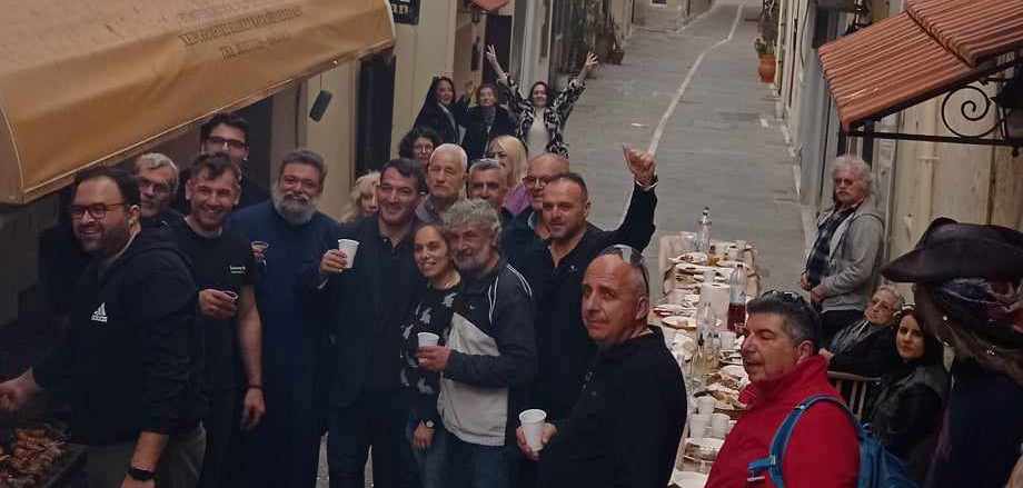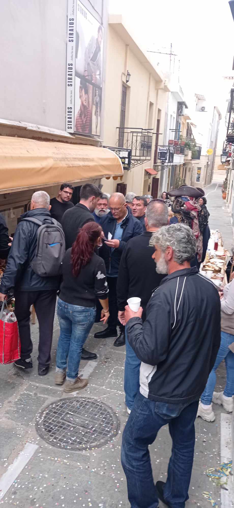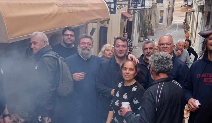 Κάνοντας βόλτα στην πόλη σταματά στις παρέες που τον υποδέχονται με κρασί και μεζέδες και ανταλλάζει ευχές για την ημέρα συμμετέχοντας στην μεγάλη γιορτή που έχει στηθεί για την Τσικνοπέμπτη απ' άκρη σ' άκρη του Ρεθύμνου!