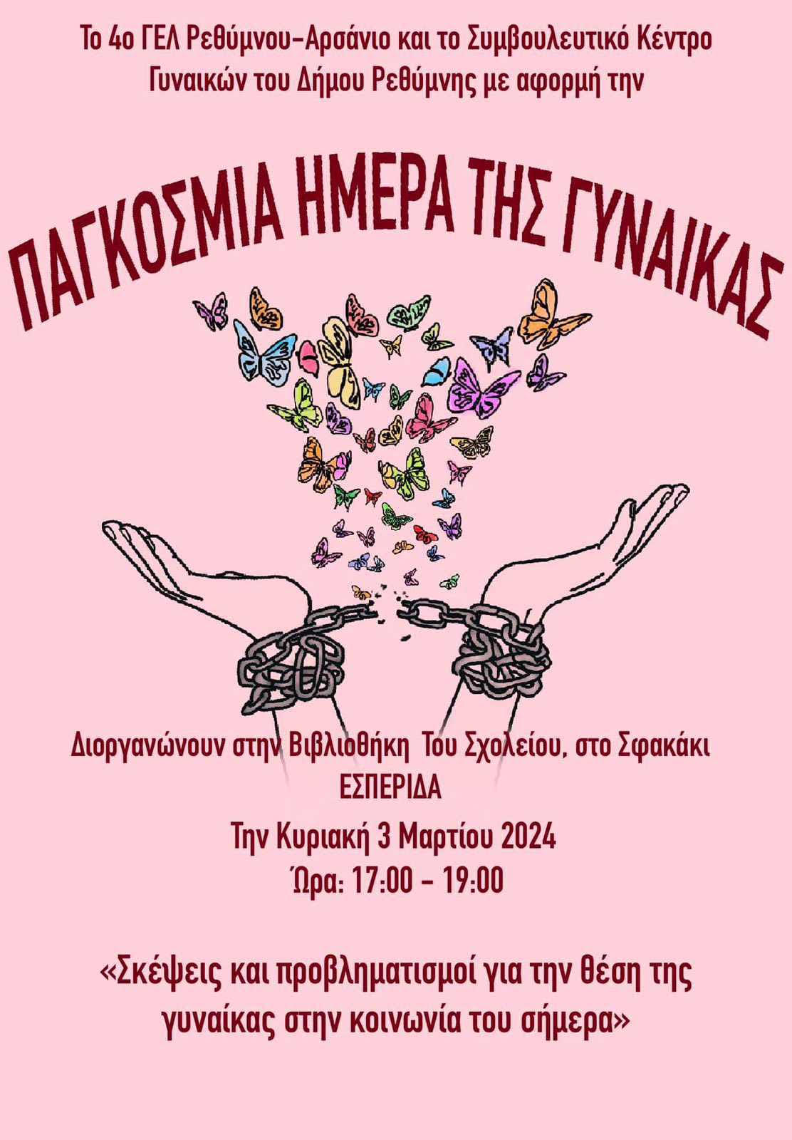 Εσπερίδα με αφορμή την Ημέρα της Γυναίκας, συνδιοργάνωσαν το Κέντρο Συμβουλευτικής Γυναικών Δήμου Ρεθύμνης με το Αρσάνιο Λύκειο (4ο Λύκειο, περιοχή Σφακάκι Ρεθύμνου), στη διάρκεια της οποίας έγιναν ενδιαφέρουσες εισηγήσεις και παρεμβάσεις από εξειδικευμένες επιστήμονες, με έμφαση στις μορφές βίας στις οποίες υπόκεινται οι γυναίκες.