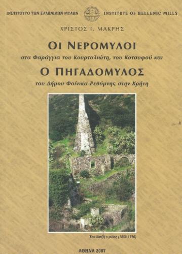 Πρόκειται για το βιβλίο με τον τίτλο «Οι νερόμυλοι στο Φαράγγι του Κουρταλιώτη, του Κοτσυφού και ο Πηγαϊδόμυλος του Δήμου Φοίνικα Ρεθύμνης στην Κρήτη». Ήταν έκδοση του Ινστιτούτου των Ελληνικών Μύλων και τυπώθηκε στην Αθήνα το 2007. Ήταν τετράχρωμο και είχε έκταση 144+4 σελίδων. Ο αείμνηστος φιλόλογος, ονοματολόγος, σπηλαιολόγος και αρχαιολόγος (επιμελητής αρχαιοτήτων Ρεθύμνου 1959-1967) είχε μελετήσει από κάθε άποψη εννέα συνολικά νερόμυλους για το βιβλίο του αυτό: κατασκευαστική, λαογραφική, ιστορική, ένταξης στο φυσικό περιβάλλον κ.ά. Πρόκειται για τρεις μύλους στο φαράγγι του Κουρταλιώτη (Τζενεύρη, Κάτω Μύλος, Παλιόμυλος), πέντε μύλους στο φαράγγι του Κοτσυφού (Μοναστηρικός, Παπά Μύλος, Χατζή Μύλος, Αλιμπάνη Μύλος, Μύλος Κακαριανής) και έναν στην περιοχή της Σούδας Πλακιά (Πηγαϊδόμυλος). Τους είχε μελετήσει ύστερα από προτροπή του Άγγλου ερευνητή μύλων MichaelHarversonκαι του καθηγητή φυσικών Ανδρέα Παπαδάκη.
