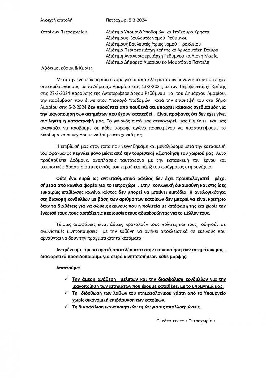 Στις 8-3-2024 πραγματοποιήθηκε Γενική Συνέλευση των κατοίκων του Πετροχωρίου με θέμα τις απαλλοτριώσεις και ενημέρωση από την Επιτροπή αγώνα για τα αποτελέσματα των συναντήσεων της με τον Περιφερειάρχη Κρήτης κο Αρναουτάκη Σταύρο ,την Αντπεριφερειάρχη Ρεθύμνου κα Λιονή Μαρία και τον Δήμαρχο Αμαρίου Κο Μουρτζανό Παντελή.