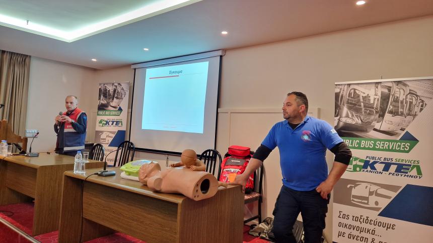Τις βασικές ενέργειες οι οποίες πολλές φορές αποδεικνύονται σωτήριες για την ζωή ενός συνανθρώπου μας που ξαφνικά βρίσκεται αντιμέτωπος με κάποιο πρόβλημα υγείας, παρουσίασαν οι δύο εκπαιδευτές - διασώστες του τομέα Ρεθύμνου του ΕΚΑΒ Κρήτης, κ.κ. Μανόλης Λέκκας και Ανδρέας Βουρβαχάκης, στους δεκάδες εργαζόμενους του Σταθμού του Ρεθύμνου της «ΚΤΕΛ Χανίων – Ρεθύμνου Α.Ε.».