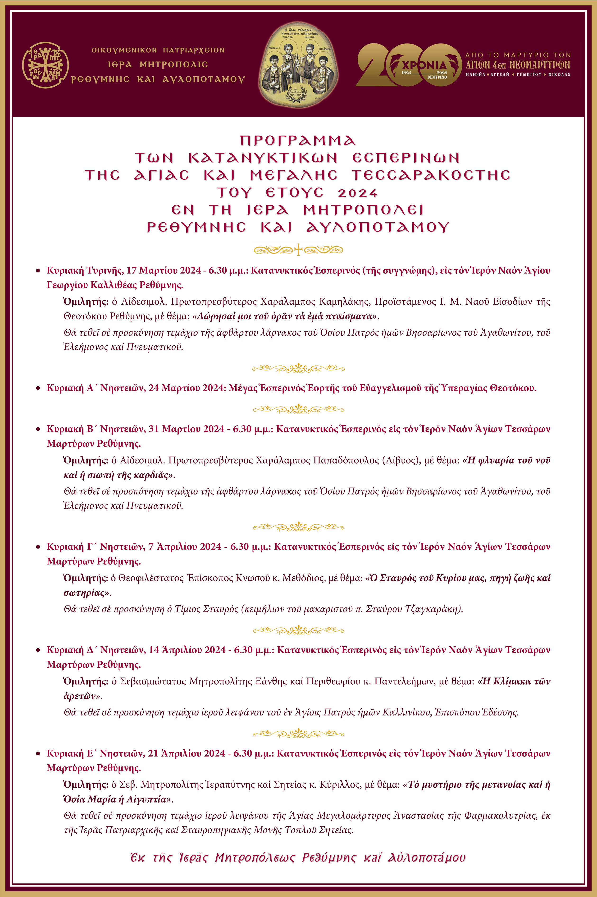 - Κυριακή Β´ Νηστειών, 31 Μαρτίου 2024 - 6.30 μ.μ.: Κατανυκτικός Εσπερινός εις τον Ιερόν Ναόν Αγίων Τεσσάρων Μαρτύρων Ρεθύμνης.