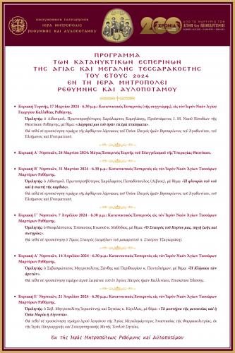 ΠΡΟΓΡΑΜΜΑ ΤΩΝ ΚΑΤΑΝΥΚΤΙΚΩΝ ΕΣΠΕΡΙΝΩΝ ΤΗΣ ΑΓΙΑΣ ΚΑΙ ΜΕΓΑΛΗΣ ΤΕΣΣΑΡΑΚΟΣΤΗΣ ΤΟΥ ΕΤΟΥΣ 2024