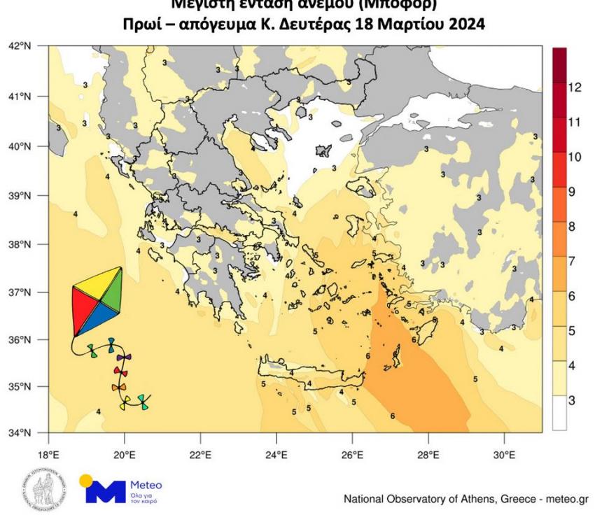 Στον παρακάτω χάρτη παρουσιάζονται με αποχρώσεις του κίτρινου οι περιοχές στις οποίες περιμένουμε εντάσεις ανέμων πάνω από 3 Μποφόρ την Καθαρά Δευτέρα 18/3, σύμφωνα με τα προγνωστικά στοιχεία του Εθνικού Αστεροσκοπείου Αθηνών / meteo.gr, ενώ με γκρι χρώμα οι περιοχές στις οποίες η ένταση των ανέμων δεν ευνοεί το πέταγμα του χαρταετού.
