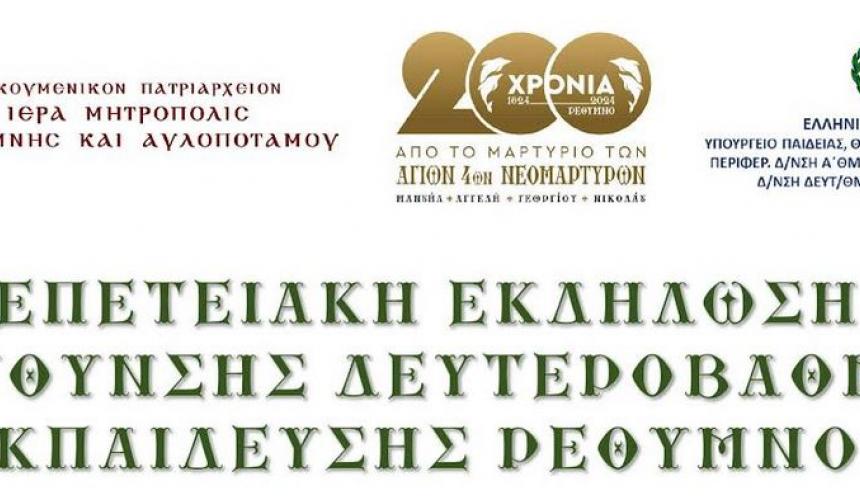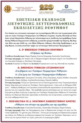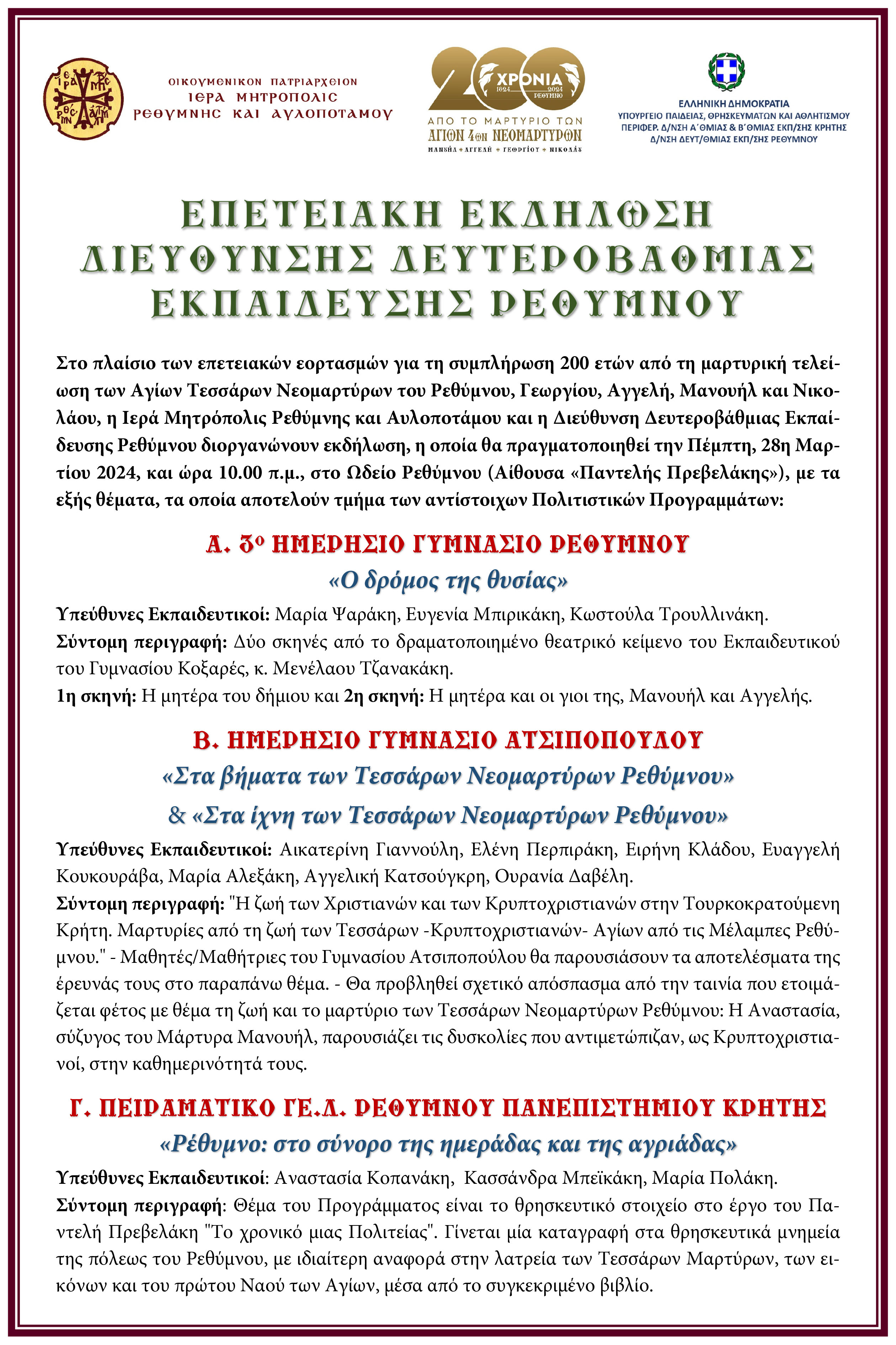 Στο πλαίσιο των επετειακών εορτασμών για τη συμπλήρωση 200 ετών από τη μαρτυρική τελείωση των Αγίων Τεσσάρων Νεομαρτύρων του Ρεθύμνου, Γεωργίου, Αγγελή, Μανουήλ και Νικολάου, η Ιερά Μητρόπολις Ρεθύμνης και Αυλοποτάμου και η Διεύθυνση Δευτεροβάθμιας Εκπαίδευσης Ρεθύμνου διοργανώνουν εκδήλωση, η οποία θα πραγματοποιηθεί την Πέμπτη, 28η Μαρτίου 2024, και ώρα 10.00 π.μ., στο Ωδείο Ρεθύμνου (Αίθουσα «Παντελής Πρεβελάκης»), με τα εξής θέματα, τα οποία αποτελούν τμήμα των αντίστοιχων Πολιτιστικών Προγραμμάτων: