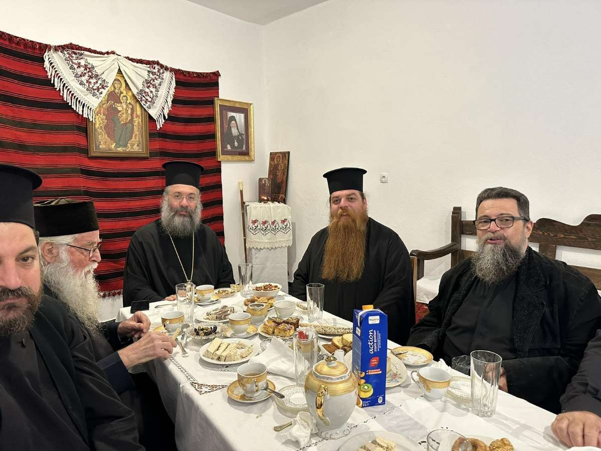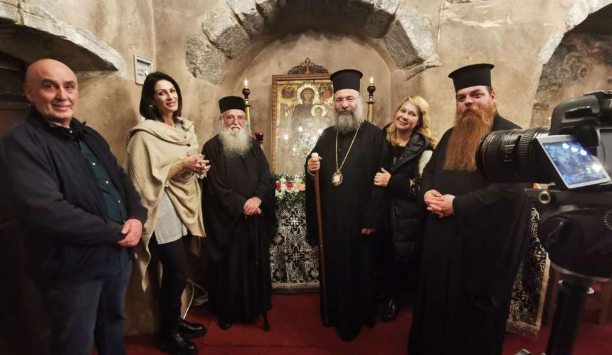 Μετά το πέρας της Θείας Λειτουργίας, ο Σεβασμιώτατος απηύθυνε χαιρετισμό στο επιτελείο της εκπομπής «Παρέα με την Αριστέα» από τη «Νέα Τηλεόραση», οι οποίοι προσήλθαν για την προετοιμασία τηλεοπτικού αφιερώματος στα Μυριοκέφαλα.