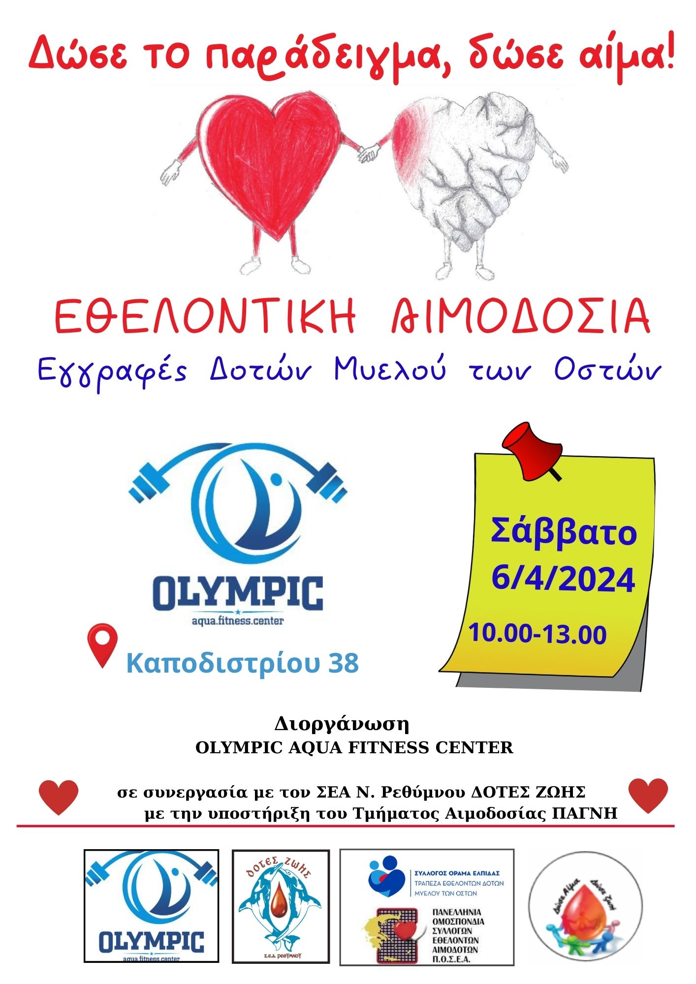 Εθελοντική Αιμοδοσία στο Olympic Aqua Fitness Center στο Ρέθυμνο θα πραγματοποιηθεί Το ΣΑΒΒΑΤΟ 6 Απριλίου 2024 στον αθλητικό χώρο του γυμναστηρίου στην οδό Καποδιστρίου 38, τις ώρες 10.00 - 13.00.