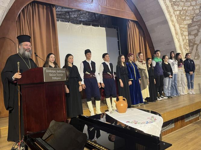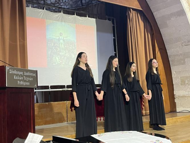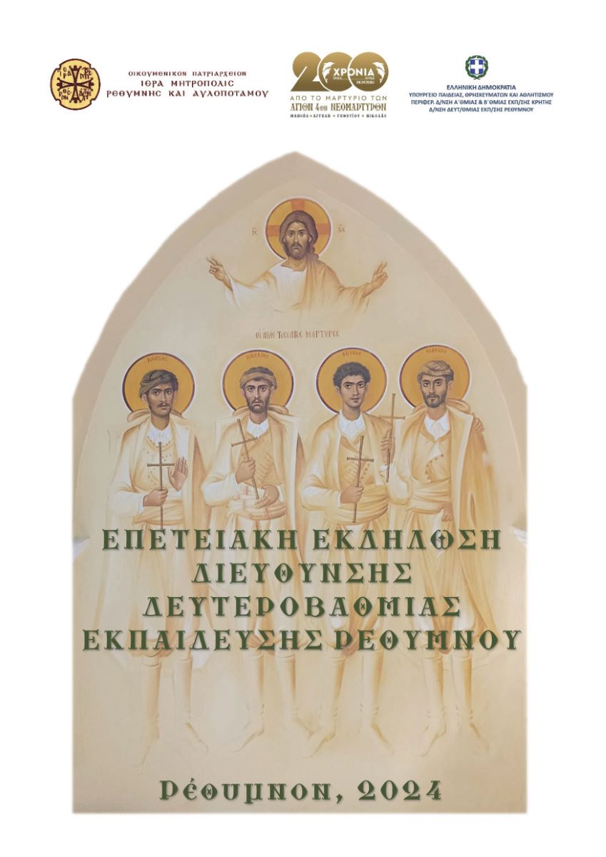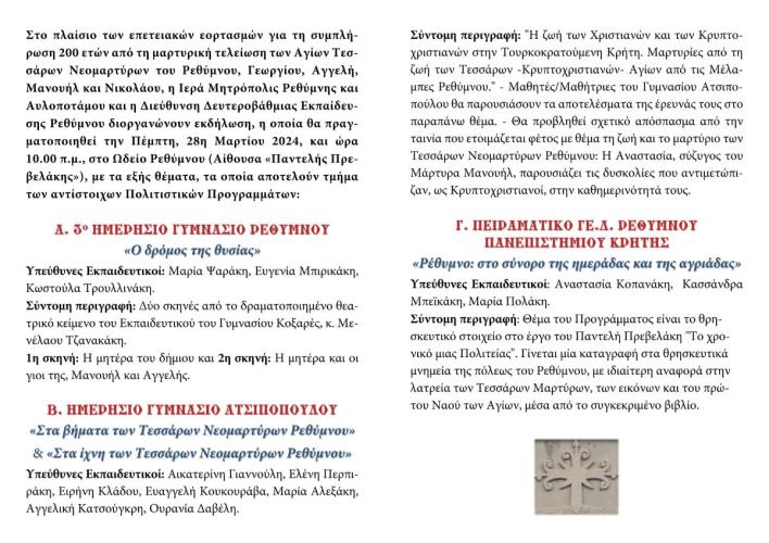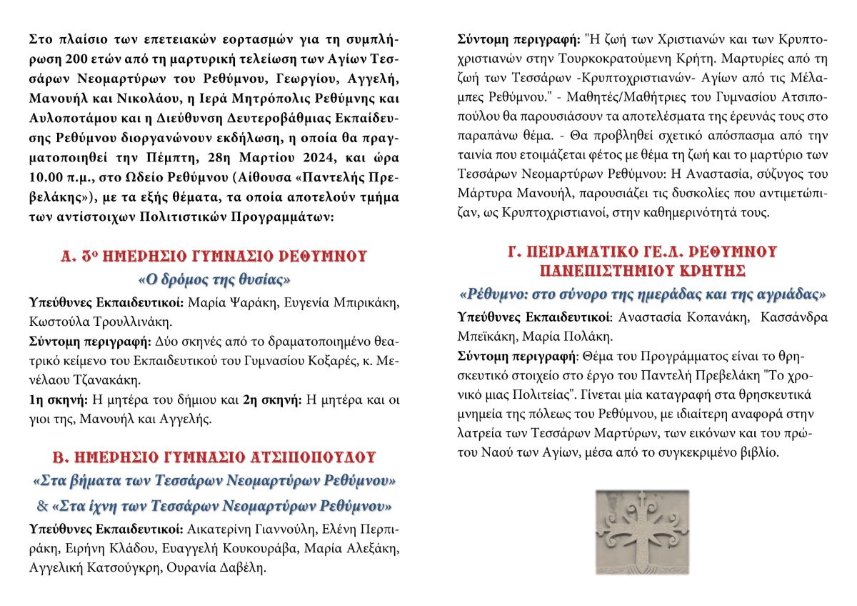 Με επιτυχία πραγματοποιήθηκε, το πρωί της Πέμπτης, 28ης Μαρτίου 2024, στο Ωδείο Ρεθύμνου (Αίθουσα «Παντελής Πρεβελάκης»), εκδήλωση της Ιεράς Μητροπόλεως Ρεθύμνης και Αυλοποτάμου και της Διεύθυνσης Δευτεροβάθμιας Εκπαίδευσης Ρεθύμνου, στο πλαίσιο των επετειακών εορτασμών για τη συμπλήρωση 200 ετών από τη μαρτυρική τελείωση των Αγίων Τεσσάρων Νεομαρτύρων Γεωργίου, Αγγελή, Μανουήλ και Νικολάου, των εν Ρεθύμνη μαρτυρησάντων.
