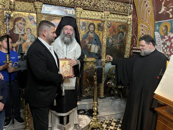Εκ μέρους του Οικισμού τον Σεβασμιώτατο καλωσόρισε, στην πρώτη του αυτή ποιμαντική επίσκεψη, ο Εφημέριος, Αιδεσιμολ. Πρωτοπρεσβύτερος Δημήτριος Καραγιαννάκης, ο οποίος αναφέρθηκε στην ιστορία του χωριού καθώς και στην πολύτιμη βοήθεια πολλών ανθρώπων για τη στήριξη και ενίσχυση του μικρού αυτού Οικισμού και τον ευπρεπισμό του Ιερού Ναού του Αγίου Γεωργίου.