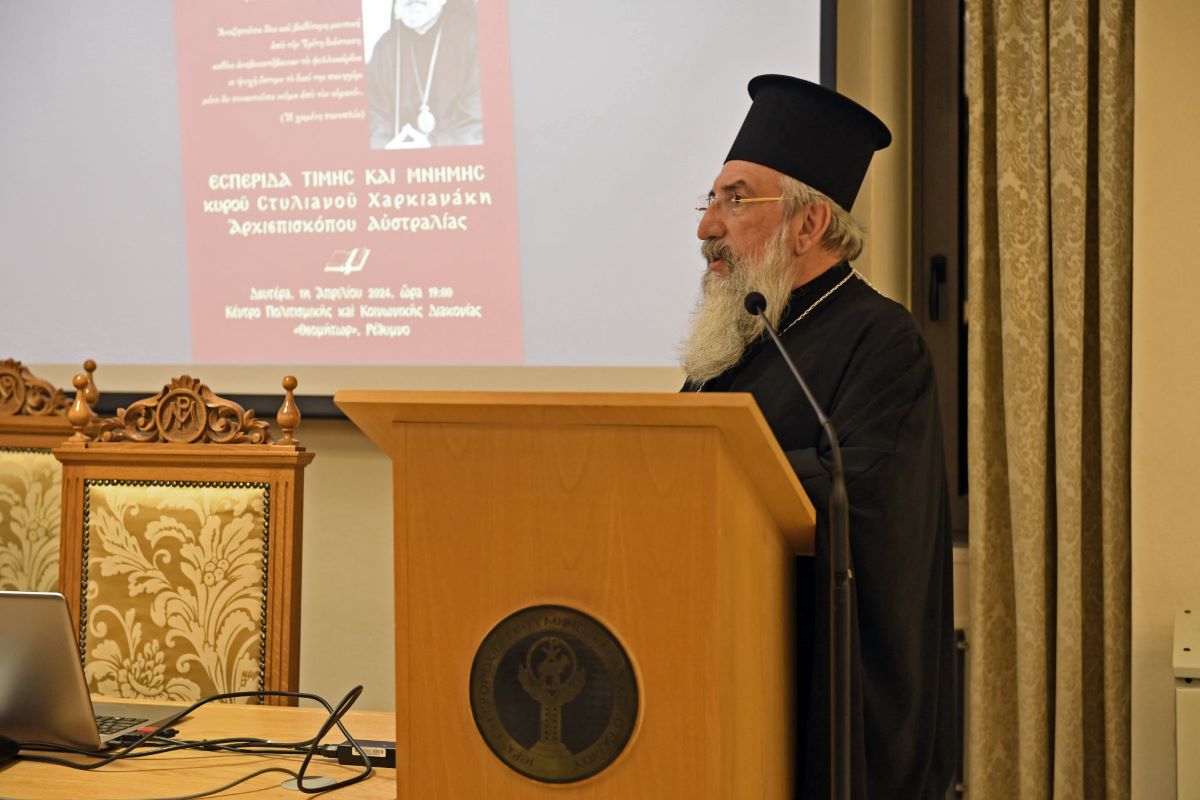 Το απόγευμα της Δευτέρας, 1ης Απριλίου 2024, στο Κέντρο Πολιτισμικής και Κοινωνικής Διακονίας της Ιεράς Μητροπόλεως Ρεθύμνης και Αυλοποτάμου «ΘΕΟΜΗΤΩΡ», στο πλαίσιο των επετειακών εορτασμών για τη συμπλήρωση 200 ετών από τη μαρτυρική τελείωση των εν Ρεθύμνη Αγίων Τεσσάρων Νεομαρτύρων, πραγματοποιήθηκε Εσπερίδα Τιμής και Μνήμης επί τη συμπληρώσει 5 ετών από της εις Κύριον εκδημίας του μακαριστού Αρχιεπισκόπου Αυστραλίας κυρού Στυλιανού του Χαρκιανάκη, του Ρεθυμνίου.