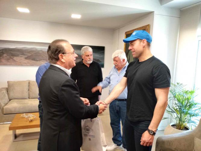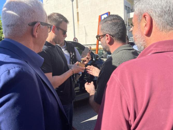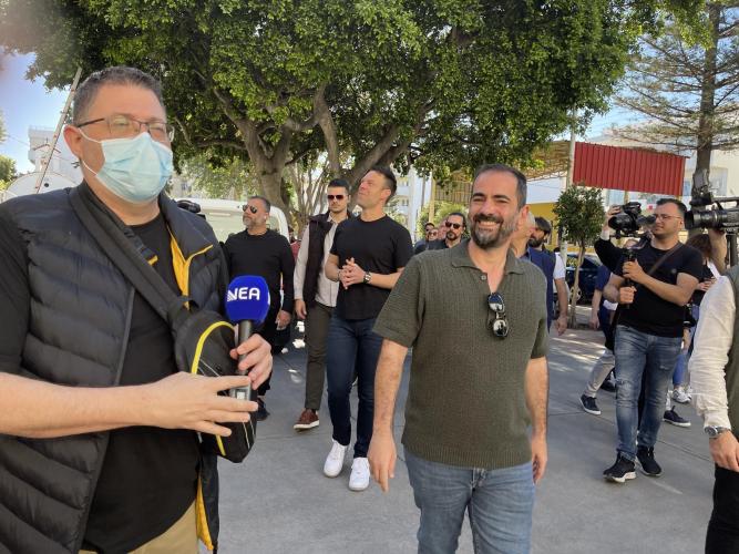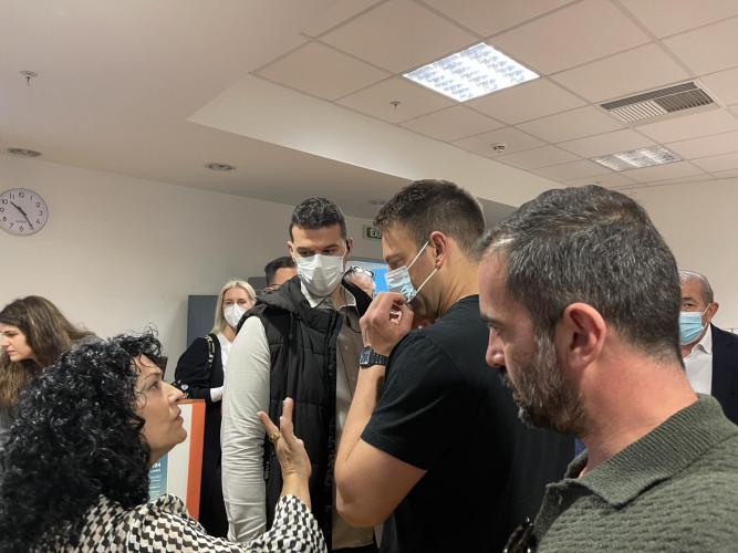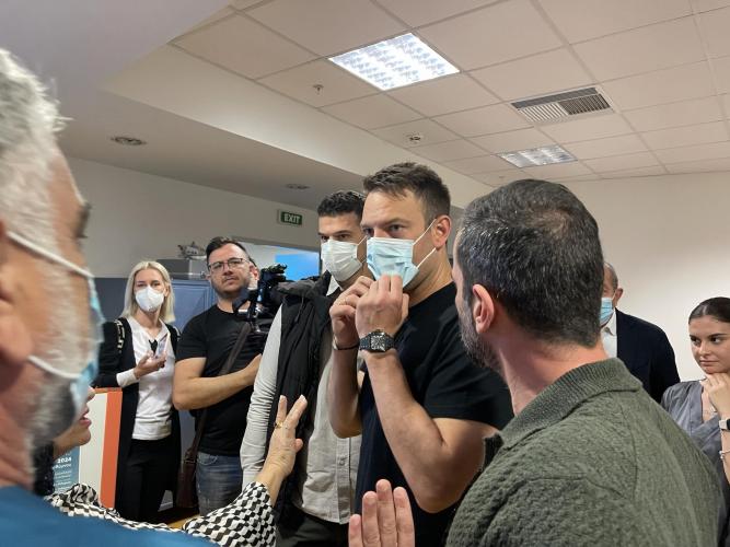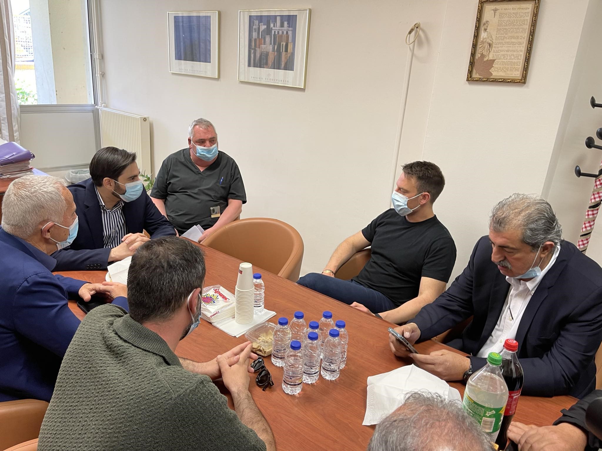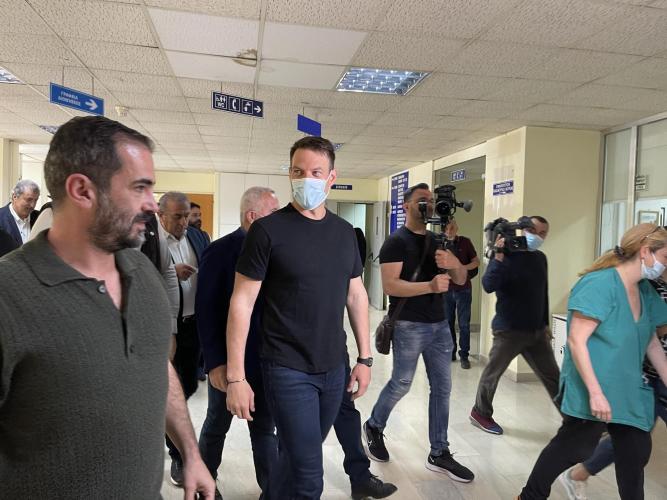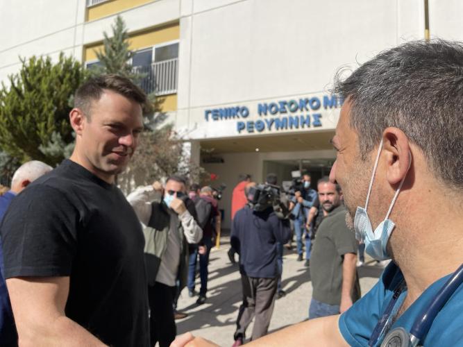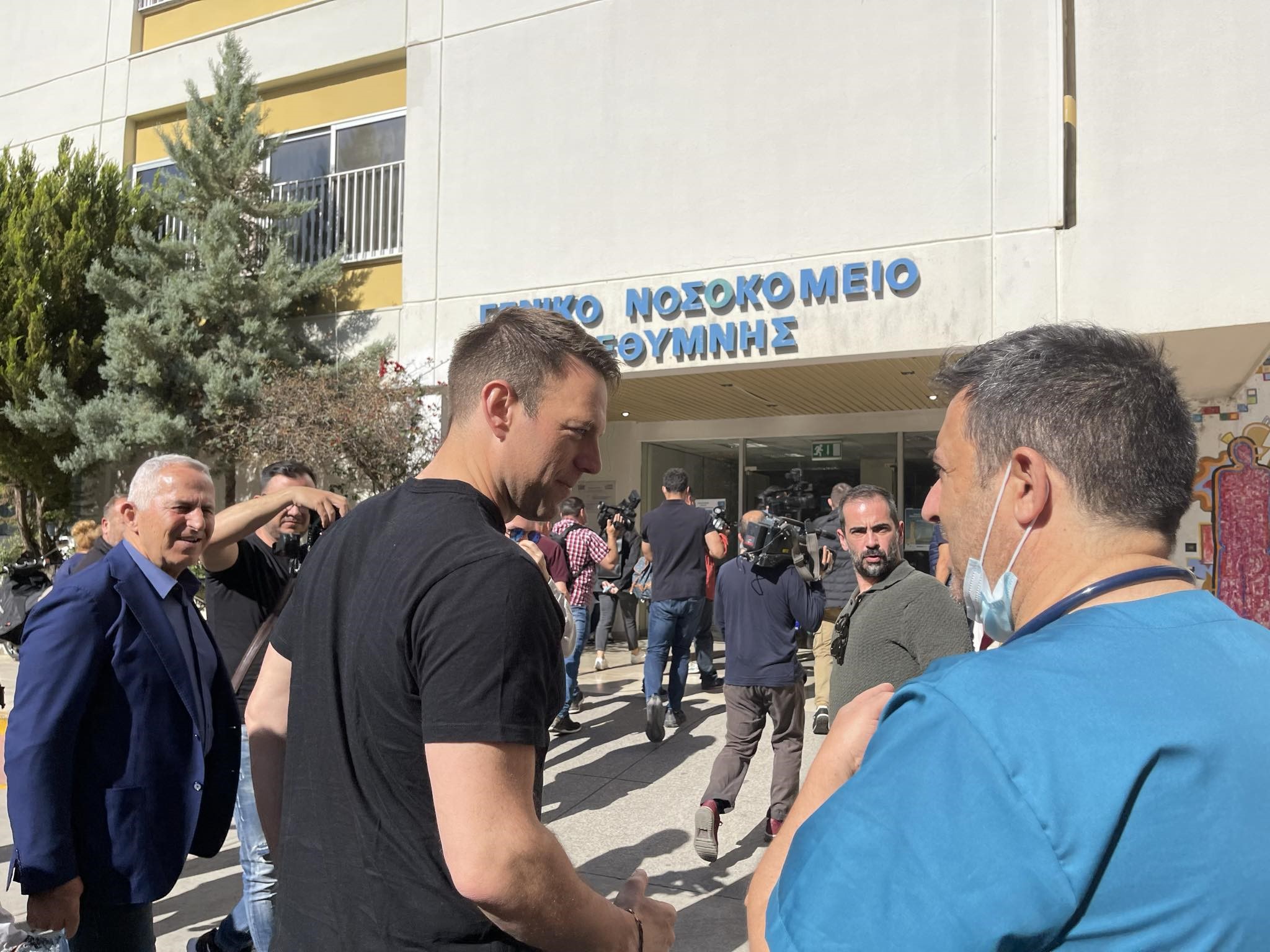 Με το που έφτασε στην αυλή του νοσοκομείου είχε μια σύντομη συνομιλία με τον Πρόεδρο της Ένωσης Γιατρών ΕΣΥ Ρεθύμνου Γιάννης Σαριδάκης και ακολούθως προχώρησε για την επίσκεψη του και τις επαφές του στο ίδρυμα.