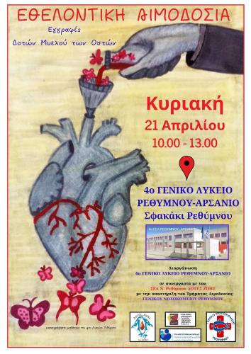Μία δράση εθελοντικής προσφοράς σε αίμα, με την πολύτιμη υποστήριξη του ιατρικού και νοσηλευτικού προσωπικού του Γενικού νοσοκομείου Ρεθύμνου. Οι συμμετέχοντες θα έχουν, επίσης, τη δυνατότητα να ενημερωθούν για τη δωρεά μυελού των οστών και να κάνουν εγγραφή ως εθελοντές δότες αιμοποιητικών κυττάρων/μυελού των οστών στο Εθνικό και Παγκόσμιο Αρχείο μυελού των οστών.