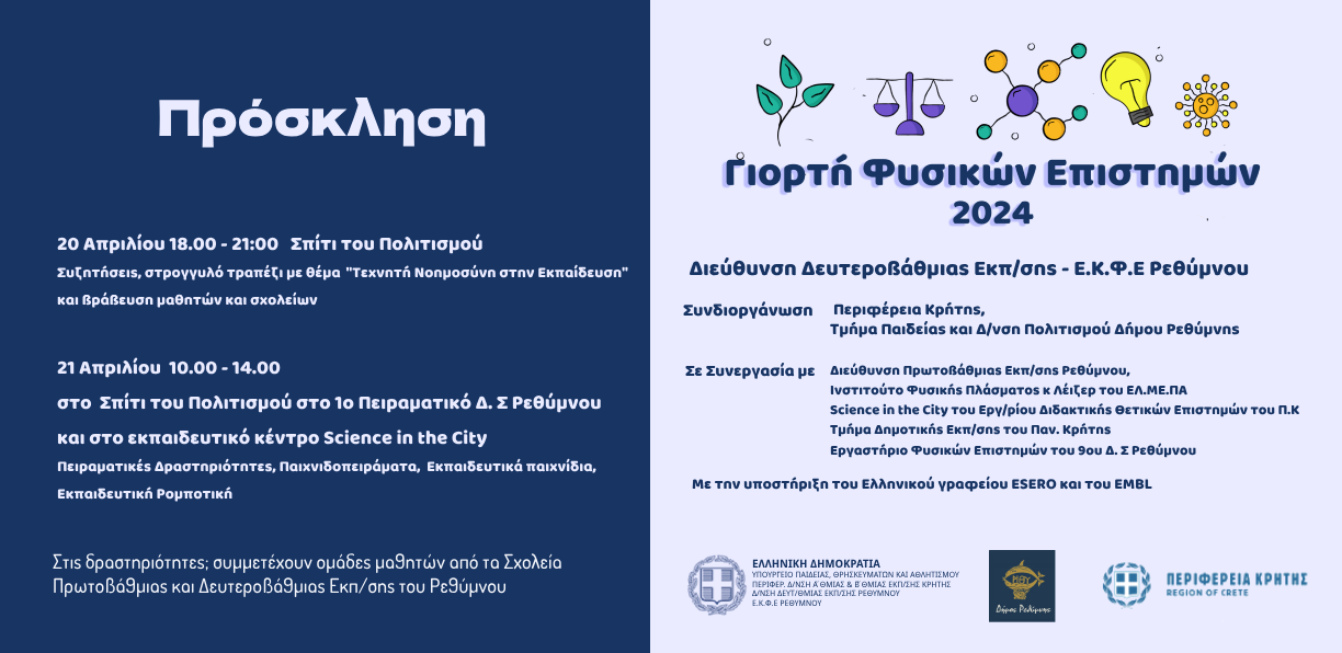 H Γιορτή των Φυσικών Επιστημών διοργανώνεται από τη Διεύθυνση Δευτεροβάθμιας Εκπ/σης Ρεθύμνου δια του Ε.Κ.Φ.Ε Ρεθύμνου. Συνδιοργανωτές είναι η Περιφέρεια Κρήτης, το Τμήμα Παιδείας και η Δ/νση Πολιτισμού του Δήμου Ρεθύμνης, σε συνεργασία με τη Διεύθυνση Πρωτοβάθμιας Εκπ/σης και το Εργαστήριο Φυσικών Επιστημών στο 9ο Δ.Σ. Ρεθύμνου, με το Ινστιτούτο Φυσικής Πλάσματος και Λέιζερ του ΕΛΜΕΠΑ, το κέντρο Science in the City του Εργαστηρίου Διδακτικής Θετικών Επιστημών και το Εργαστήριο Εκπ/κης Ρομποτικής του Παιδαγωγικού Τμήματος Δημ. Εκπαίδευσης του Παν. Κρήτης. Η εκδήλωση υποστηρίζεται επίσης από το ελληνικό γραφείο ESERO και το EMBL (Ευρωπαϊκό Εργαστήριο Μοριακής Βιολογίας).