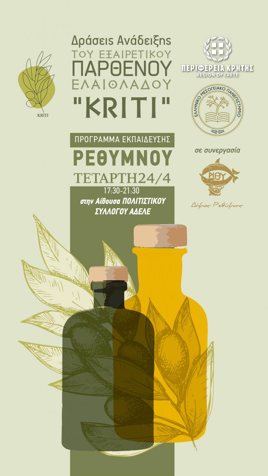 Η ενημερωτική εκπαίδευση για την ποιότητα του Εξαιρετικού Παρθένου Ελαιόλαδου “Kriti” , θα πραγματοποιηθεί την Τετάρτη, 24 Απριλίου 2024 στις 17:30, στην Αίθουσα του Πολιτιστικού Συλλόγου στο Άδελε.
