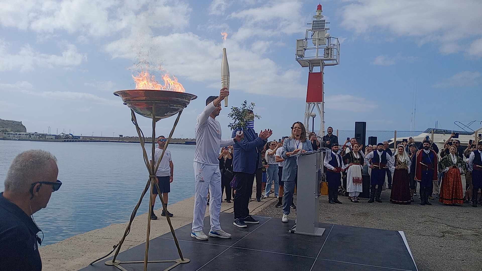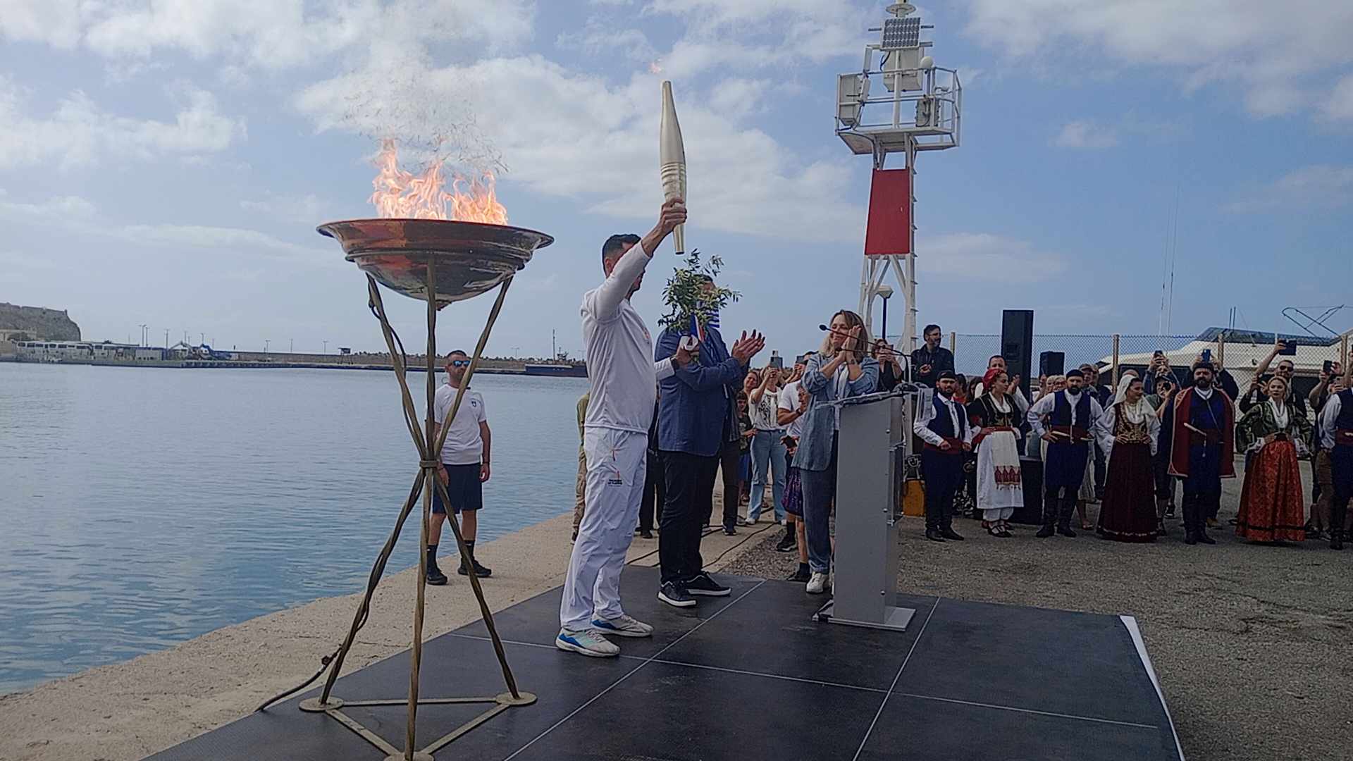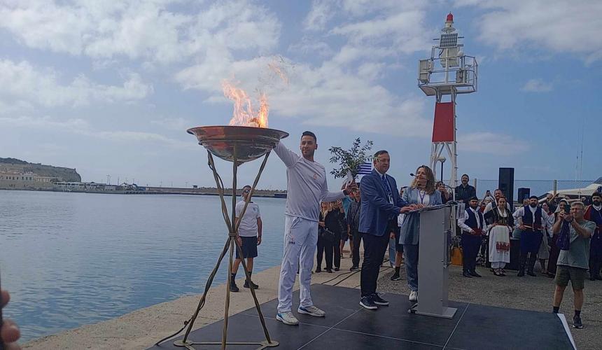 Πλήθος κόσμου έσπευσε να υποδεχτεί σήμερα το απόγευμα στη μαρίνα Ρεθύμνου την Ολυμπιακή Φλόγα, που ταξιδεύει σε όλη την Ελλάδα με τελικό προορισμό το Παρίσι και τους Ολυμπιακούς Αγώνες 2024.
