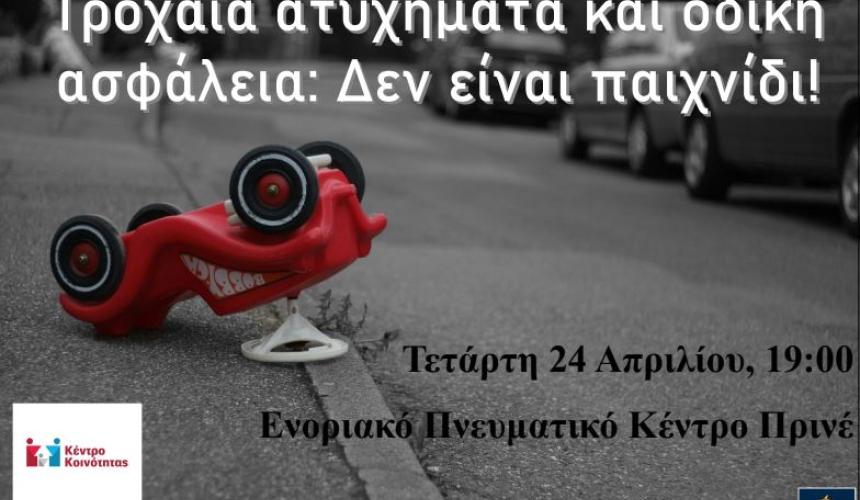 Συμβάλλοντας στην πρόληψη των τροχαίων ατυχημάτων το Κέντρο Κοινότητας της Διεύθυνσης Κοινωνικών Υπηρεσιών του Δήμου Ρεθύμνης σε συνεργασία με την Δημοτική Κοινότητα Πρινέ, διοργανώνουν εκδήλωσης ευαισθητοποίησης και ενημέρωσης των συμπολιτών με θέμα :
