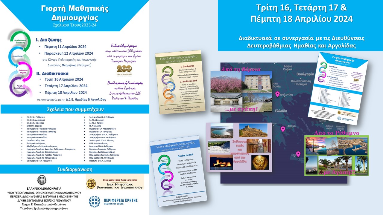 Με μεγάλη επιτυχία ολοκληρώθηκε η Γιορτή Μαθητικής Δημιουργίας Σχολικού Έτους 2023-24 που συνδιοργανώθηκε από τη Διεύθυνση Δευτεροβάθμιας Εκπαίδευσης Ρεθύμνου δια της Υπεύθυνης Σχολικών Δραστηριοτήτων, την Ιερά Μητρόπολη Ρεθύμνης και Αυλοποτάμου και την Περιφέρεια Κρήτης σε συνεργασία με τις Διευθύνσεις Δευτεροβάθμιας Εκπαίδευσης Αργολίδας και Ημαθίας.