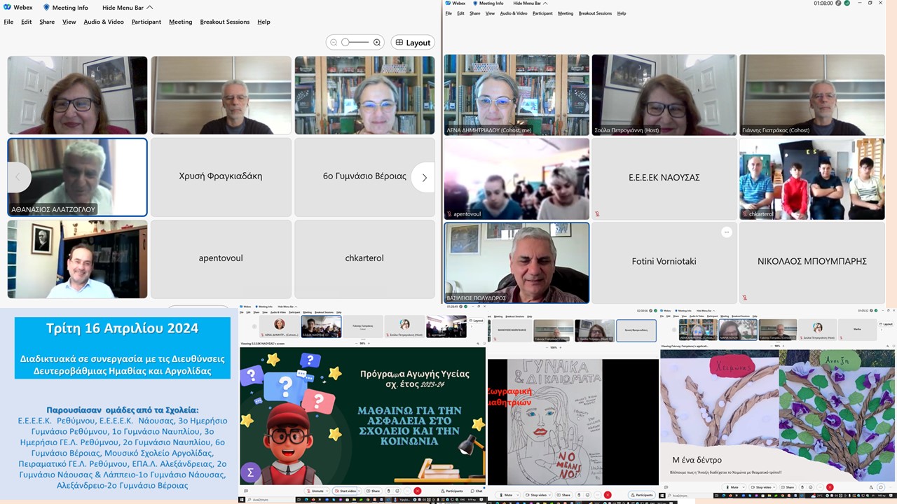 Το δεύτερο μέρος της Εκδήλωσης πραγματοποιήθηκε διαδικτυακά στην πλατφόρμα Webex την Τρίτη 16, την Τετάρτη 17 και την Πέμπτη 18 Απριλίου 2024 σε συνεργασία με τις Δ.Δ.Ε. Ημαθίας και Αργολίδας. Τις σχολικές ομάδες καλωσόρισαν οι Διευθυντές Δευτεροβάθμιας Εκπαίδευσης Ρεθύμνου, κ. Μανούσος Μαραγκάκης, Ημαθίας, κ. Αθανάσιος Αλατζόγλου και Αργολίδας, κ. Βασίλειος Πολύδωρος, ενώ τις εργασίες του τριημέρου συντόνισαν οι Υπεύθυνοι Σχολικών Δραστηριοτήτων Ρεθύμνου, κ. Σούλα Πετρογιάννη, Ημαθίας, κ. Λένα Δημητριάδου και Αργολίδας, κ. Ιωάννης Γιατράκος.