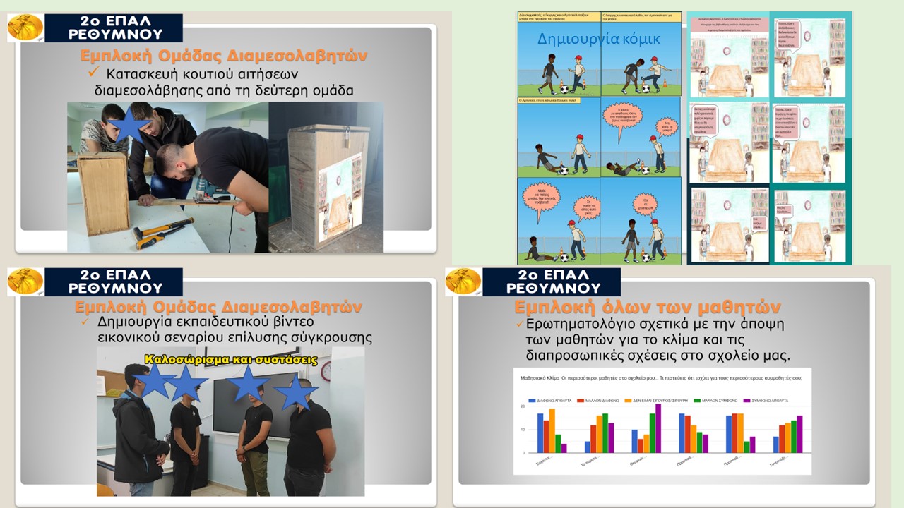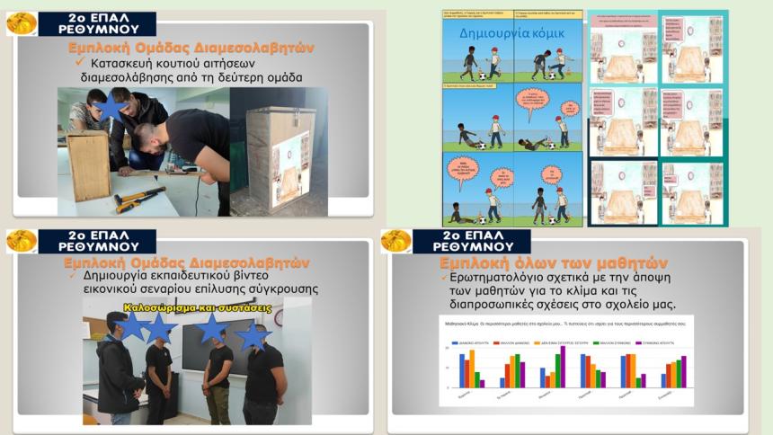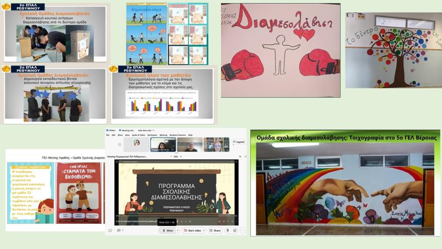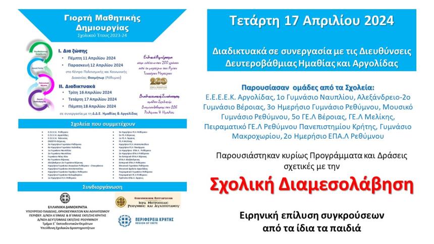 - Την Τετάρτη 17 Απριλίου 2024 παρουσίασαν ομάδες από τα Σχολεία: Ε.Ε.Ε.Ε.Κ. Αργολίδας, 1ο Γυμνάσιο Ναυπλίου, Αλεξάνδρειο-2ο Γυμνάσιο Βέροιας, 3ο Ημερήσιο Γυμνάσιο Ρεθύμνου, Μουσικό Γυμνάσιο Ρεθύμνου, 5ο ΓΕ.Λ Βέροιας, ΓΕ.Λ Μελίκης, Πειραματικό ΓΕ.Λ Ρεθύμνου Πανεπιστημίου Κρήτης, Γυμνάσιο Μακροχωρίου, 2ο Ημερήσιο ΕΠΑ.Λ. Ρεθύμνου. Παρουσιάστηκαν κυρίως Προγράμματα και Δράσεις σχετικές με την Σχολική Διαμεσολάβηση και την Ειρηνική Επίλυση συγκρούσεων από τα ίδια τα παιδιά. Τις παρουσιάσεις παρακολούθησε η κ. Δήμητρα Μουσιώλη, Νομικός, διαπιστευμένη Διαμεσολαβήτρια, που ζει και εργάζεται στο Λονδίνο και συμμετέχει σε επιμορφωτικές και εκπαιδευτικές δράσεις για τη Σχολική Διαμεσολάβηση. Επίσης, από Εκπαιδευτικούς των Διευθύνσεων Ρεθύμνου και Ημαθίας επαινέθηκε η εθελοντική προσφορά και συμβολή της κ. Ξανθίππης Νικολαΐδου, Διευθύντριας του ΕΝΕΕΓΥΛ Ρεθύμνου στην Επιμόρφωση, Εκπαίδευση και Υποστήριξη των Εκπαιδευτικών που ενδιαφέρονται να εφαρμόσουν με τους μαθητές και τις μαθήτριές τους Προγράμματα και Δράσεις Σχολικής Διαμεσολάβησης στα Σχολεία τους.