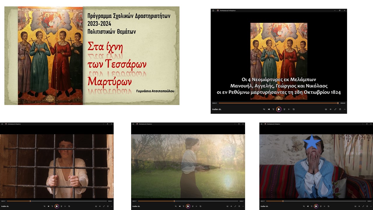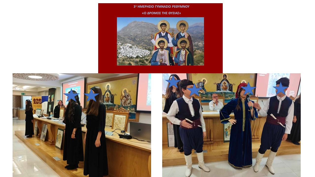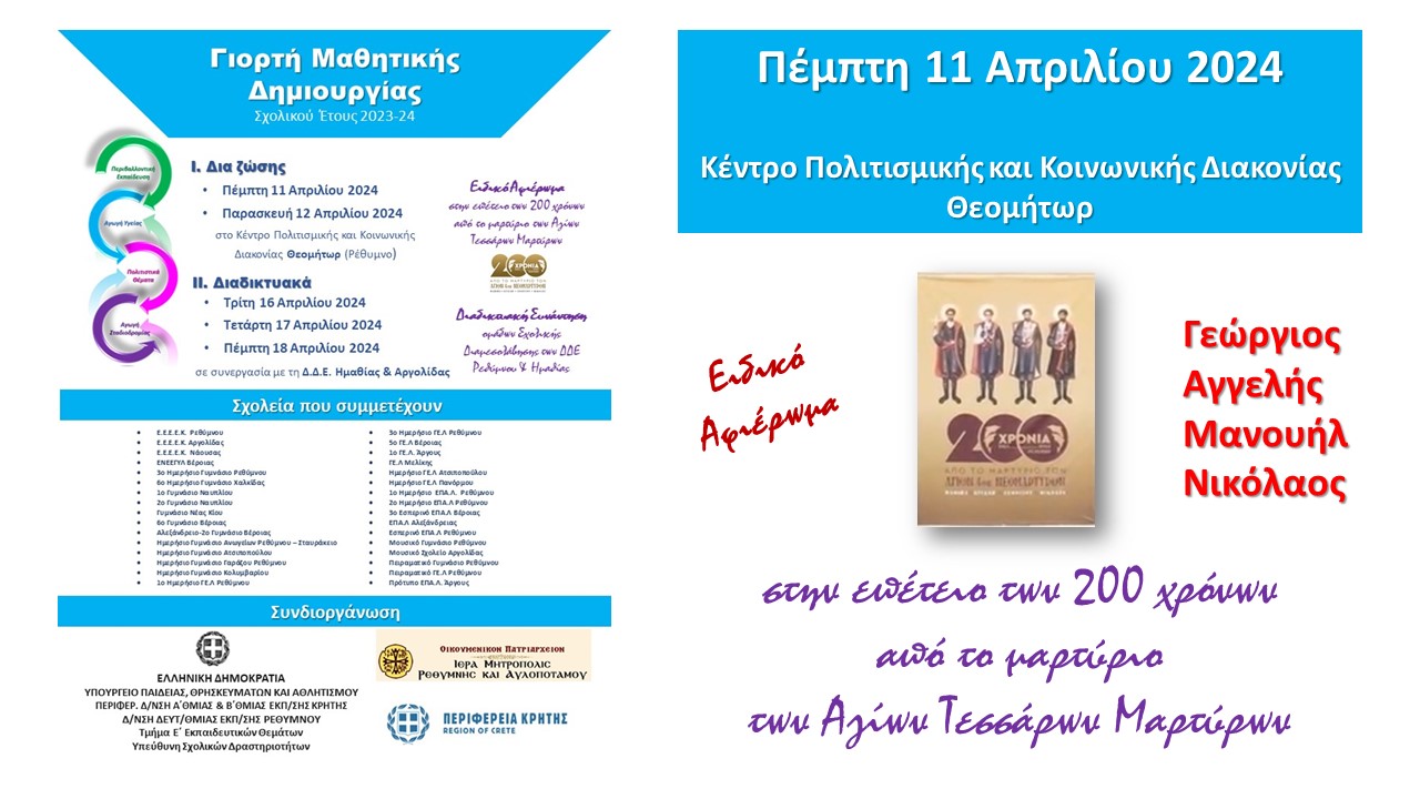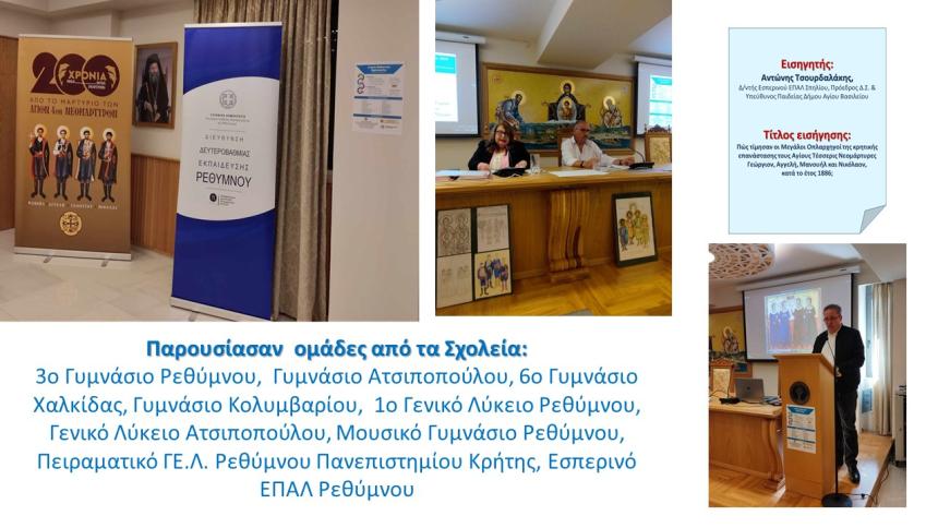 - Την Πέμπτη 11 Απριλίου 2024 ο Προϊστάμενος Εκπαιδευτικών Θεμάτων, κ. Παναγιώτης Αντωνιάδης εκπροσωπώντας τον Διευθυντή Δευτεροβάθμιας Εκπαίδευσης Ρεθύμνου, κ. Μανούσο Μαραγκάκη καλωσόρισε τους παρευρισκόμενους και κήρυξε την έναρξη της Εκδήλωσης. Η Γιορτή Μαθητικής Δημιουργίας Σχολικού Έτους 2023-24 ξεκίνησε με Ειδικό Αφιέρωμα στην επέτειο των 200 χρόνων από το μαρτύριο των Αγίων Τεσσάρων Μαρτύρων παρουσία του Σεβασμιότατου Μητροπολίτη Ρεθύμνης και Αυλοποτάμου κ. Πρόδρομου, ο οποίος χαιρέτησε την Εκδήλωση. Χαιρετισμό επίσης απηύθυνε ο Αντιδήμαρχος Παιδείας, Δια βίου Μάθησης και Νέας Γενιάς του Δήμου Ρεθύμνου, κ. Νεκτάριος Παπαδογιάννης. Χαιρετισμό και Ευχές απέστειλε με μήνυμά της η Αντιπεριφερειάρχης Ρεθύμνου κ. Μαρία Λιονή. Ακολούθησε εισήγηση από τον κ. Αντώνη Τσουρδαλάκη, Δ/ντή του Εσπερινού ΕΠΑΛ Σπηλίου, Πρόεδρο του Δημοτικού Συμβουλίου & Υπεύθυνο Παιδείας Δήμου Αγίου Βασιλείου με Τίτλο: «Πως τίμησαν οι Μεγάλοι Οπλαρχηγοί της κρητικής επανάστασης τους Αγίους Τέσσερις Νεομάρτυρες Γεώργιον, Αγγελή, Μανουήλ και Νικόλαον, κατά το έτος 1886»